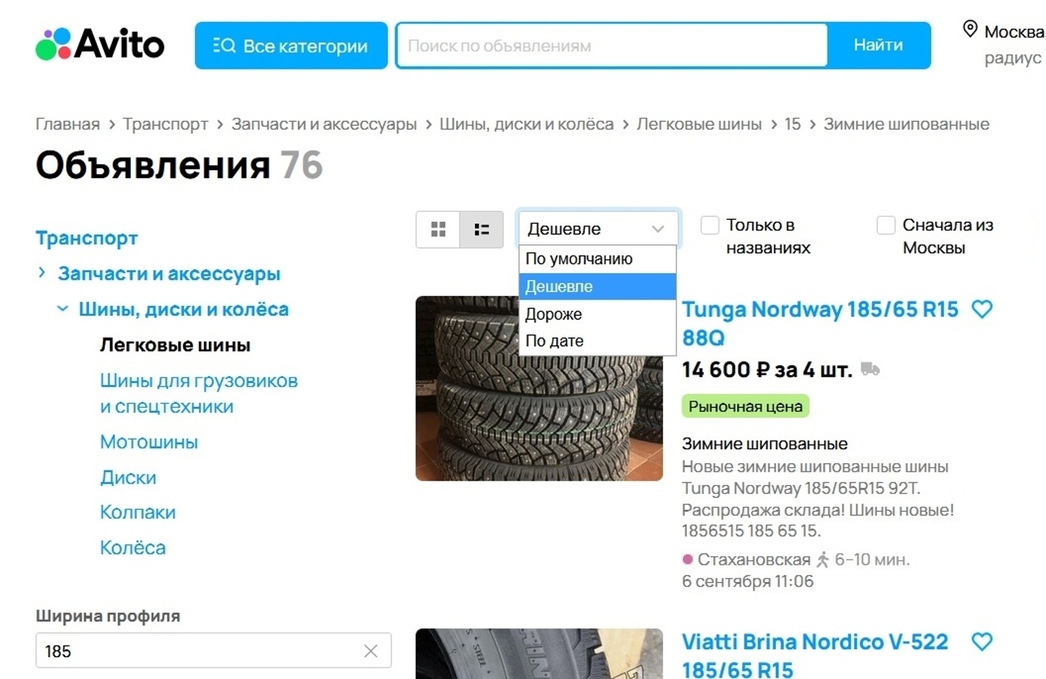 Допустим, нам нужны шипованные колеса для Hyundai Solaris. Штатные, размерностью 185/65R15. Заходим на Авито и применяем предусмотренную тут простую и интуитивно понятную систему подбора колес. С ее помощью можно использовать в поиске по платформе все мыслимые фильтры: тип ТС (грузовая, легковушка, мотоцикл и т. п.), марка автомобиля, нужная ширина, радиус и высота профиля колеса, его бренд, зимнее/летнее колесо, количество шин в комплекте, новые или подержанные и т. п. Вносим параметры нужной резины в соответствующие окошечки поиска и запускаем этот процесс.
