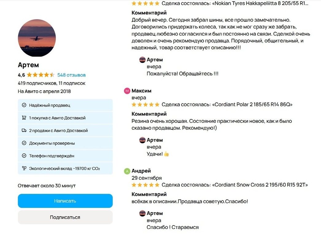 Чтобы убедиться в добросовестности и надежности продавца, можно ознакомиться с историей продаж в его профиле, не забыв пробежаться глазами по отзывам прежних клиентов. Обратите внимание на дату его регистрации на Авито: чем дольше он тут успешно работает, тем лучше. Большое количество подписчиков на его страничке также косвенно подтверждает добросовестность. Отлично, если на ней присутствует плашка «Документы проверены», подтверждающая, что продавец подтвердил свою личность по паспорту или профилю на Госуслугах.
