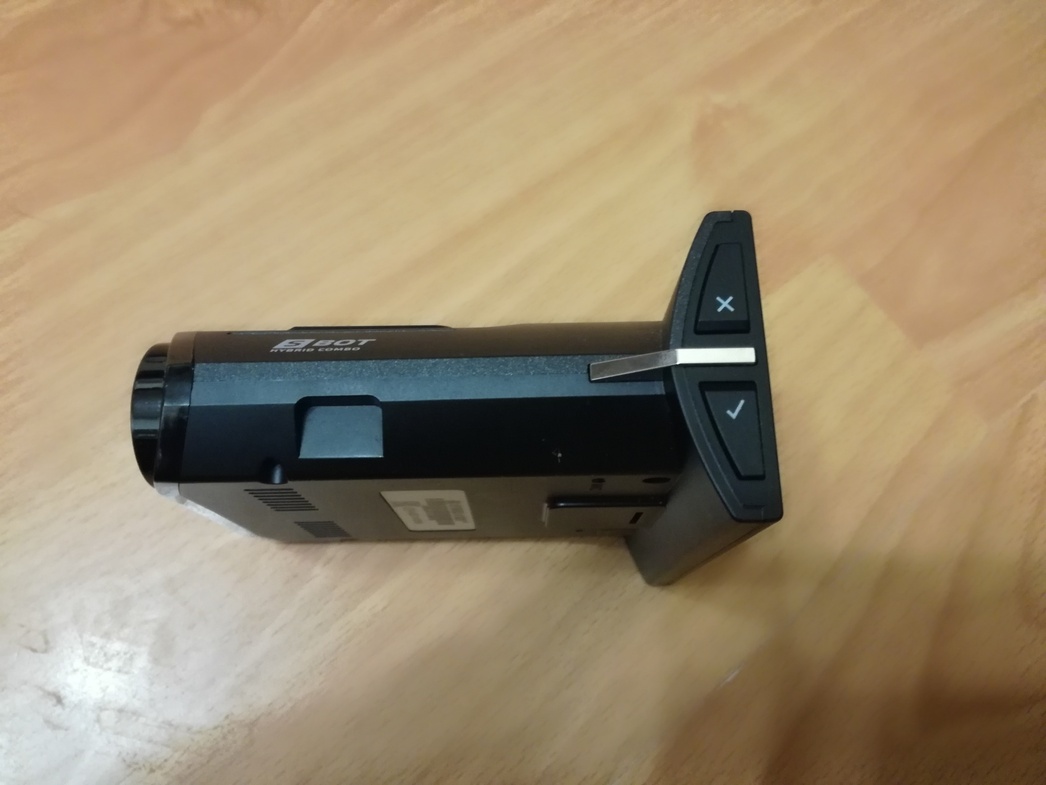 Последним в очереди на проверку стала новинка — модель, вышедшая на рынок только в 2019 году. Гаджет выполнен в классическом для комбо-устройств дизайне: к одному торцу плоского девайса пристроен довольно большой (3 дюйма) монитор, а на другом расположились «глазок» видеокамеры и датчик излучения лазера.