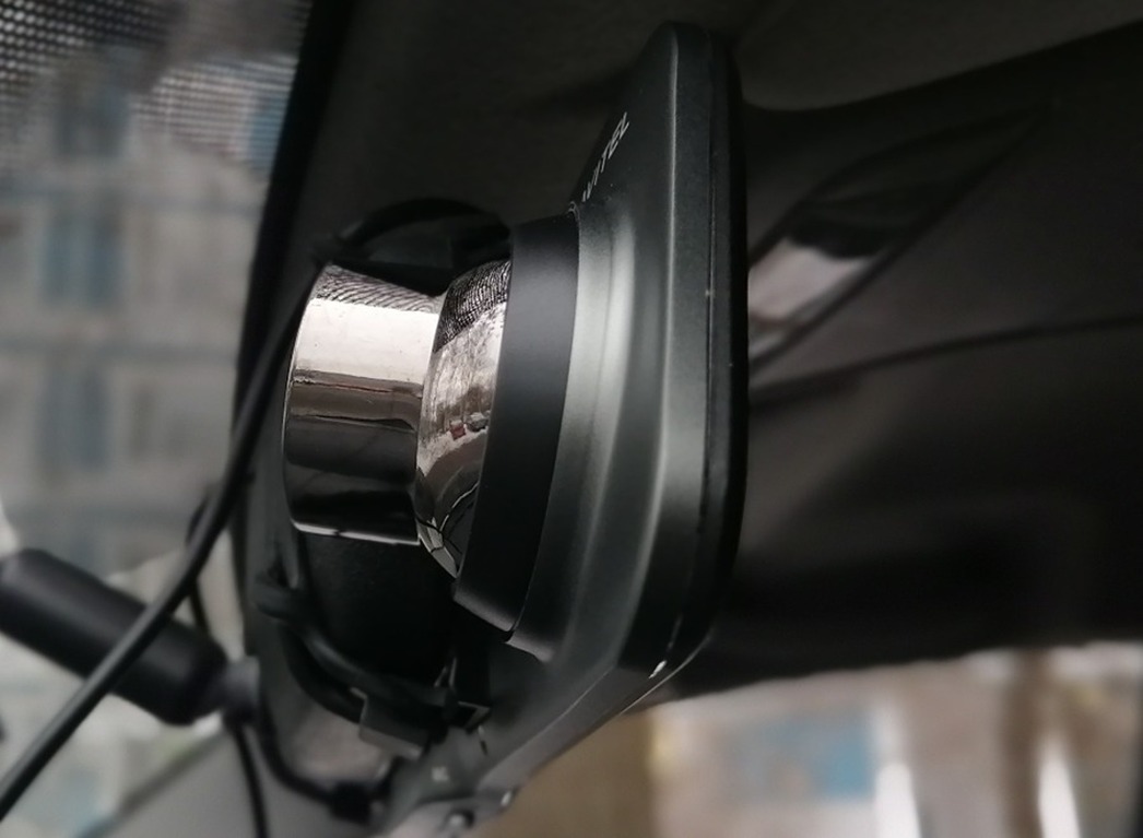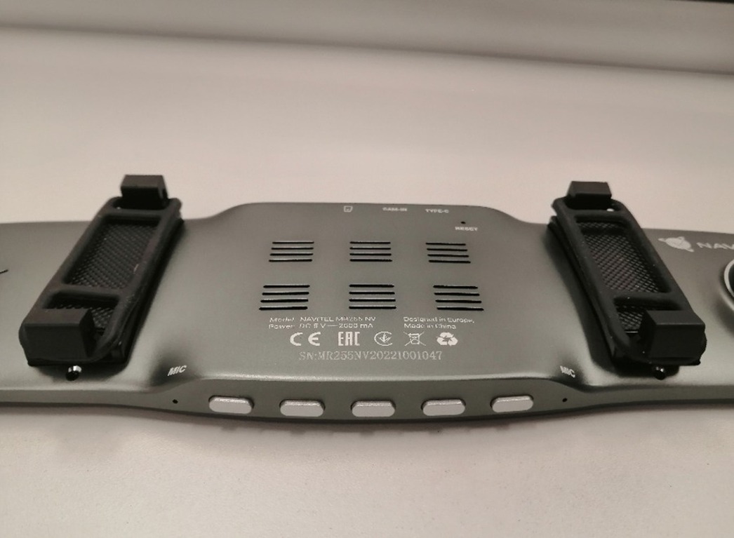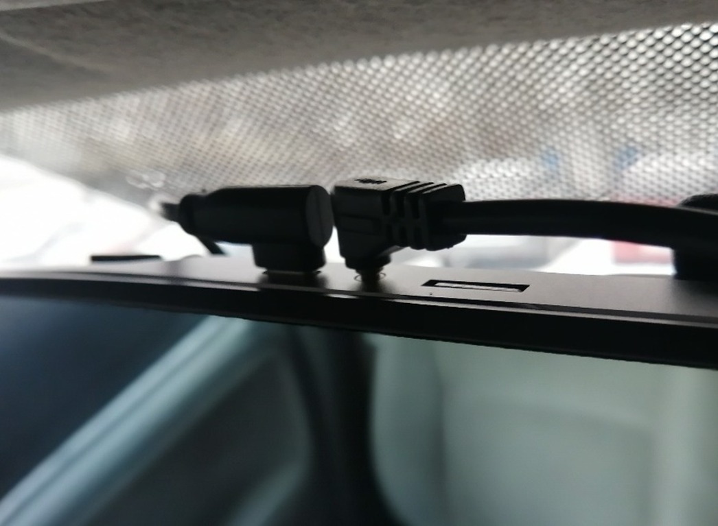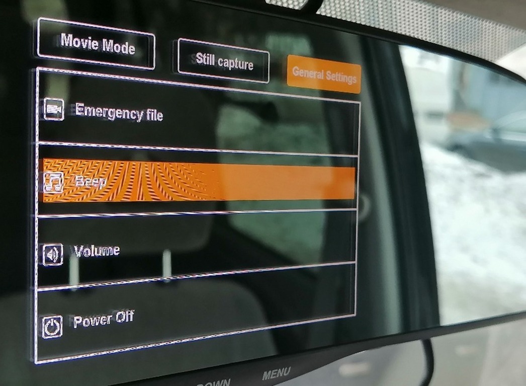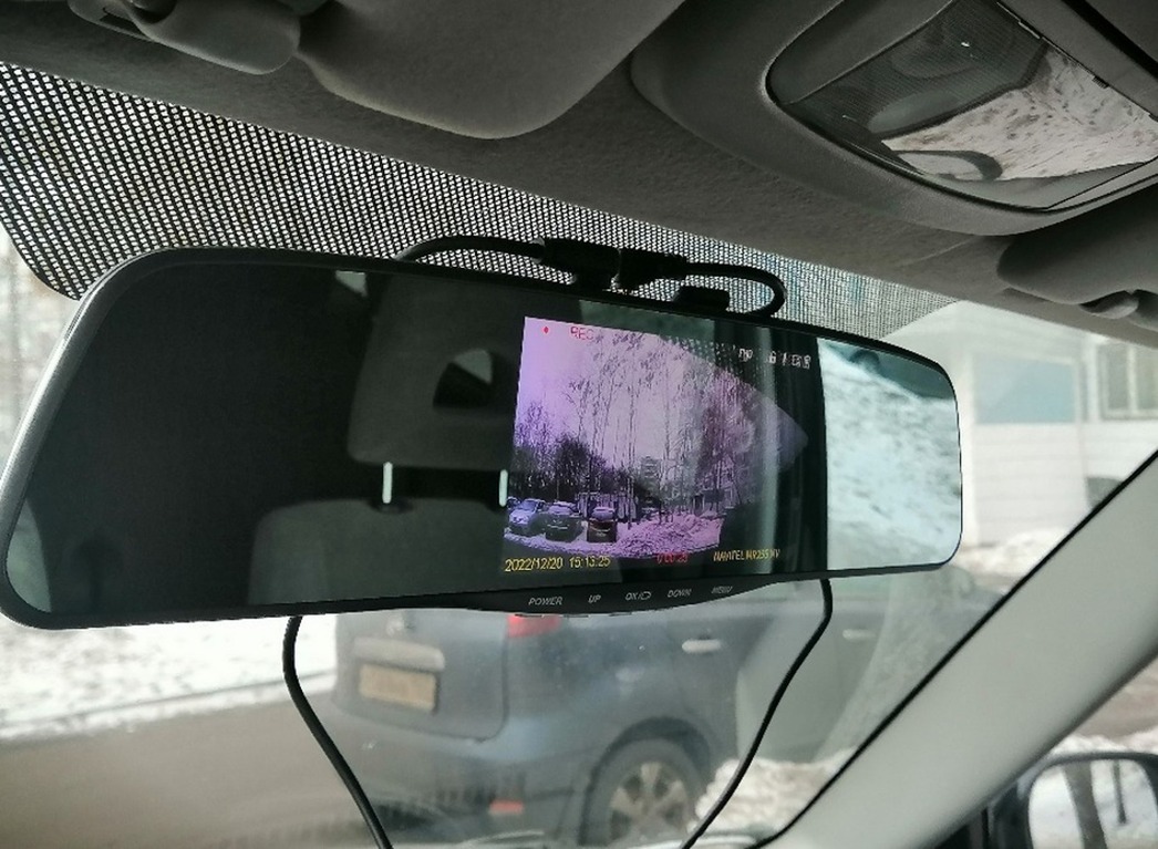 Девайс этот не только «пишет» происходящее перед капотом авто, но и фиксирует события за его кормой — с помощью дополнительной камеры. Подключение и настройка нашего «умного зеркала» — дело несложное. Провод от прикуривателя автомобиля соединяется с девайсом через разъем USB Type C, расположенный на верхней части устройства. Рядом вход разъема провода для подключения Full HD камеры заднего вида, которая на липучке намертво крепится к заднему стеклу машины. Кнопки управления и настройки расположены в нижней части прибора. Меню на 5-дюймовом цветном мониторе поделено на три раздела. Показалась полезной функция отключения монитора. Ведь он занимает существенную часть отражающей поверхности, поэтому возможность отключения «телевизора в зеркале» позволяет водителю не отвлекаться и использовать зеркало по назначению.