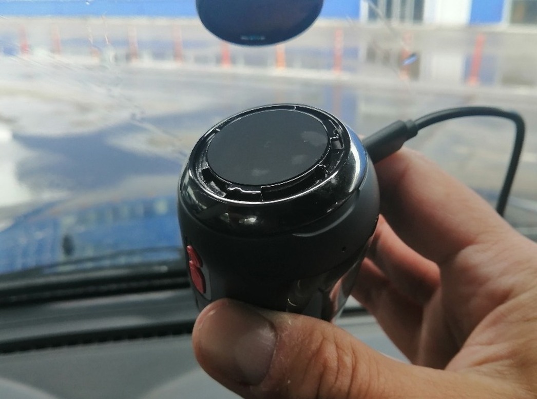 Если точнее, то вращаться вокруг вертикальной оси устройства может половинка «яйца», обращенная вниз. Она периодически вращается самостоятельно, по команде алгоритма, сидящего в «мозгах» видеорегистратора.