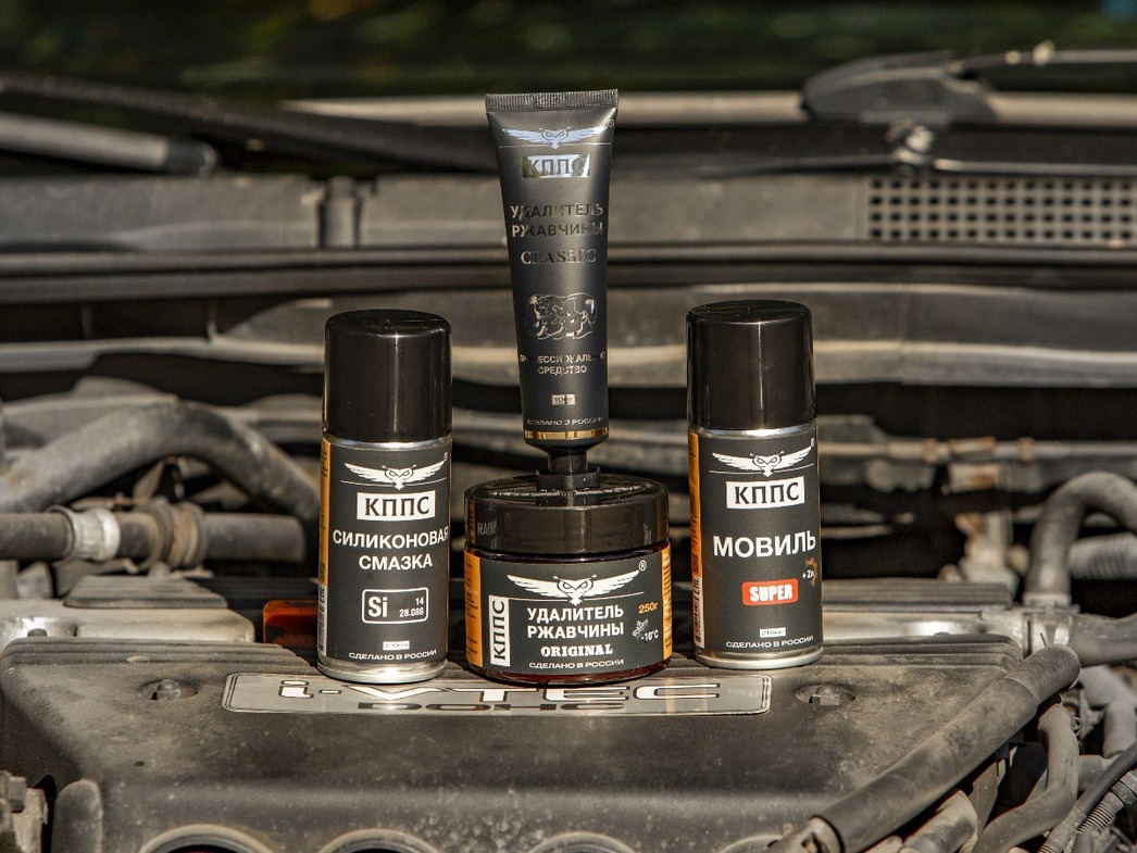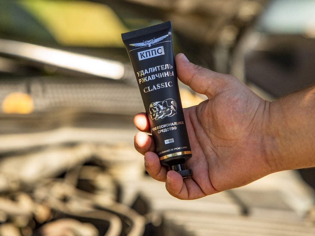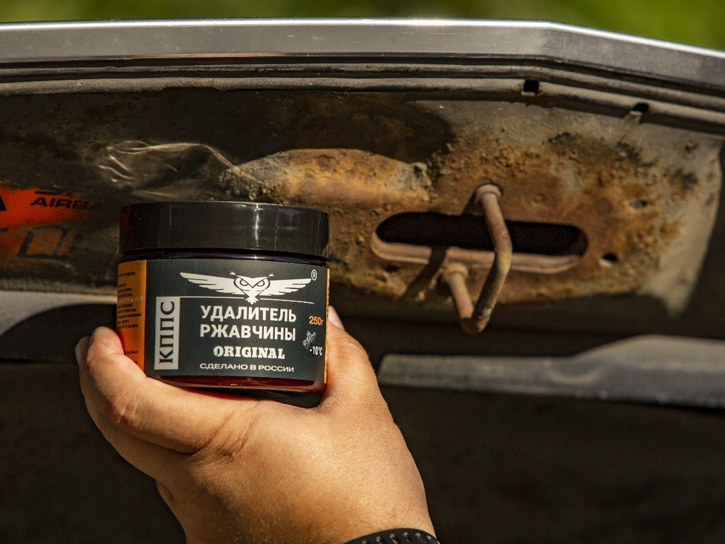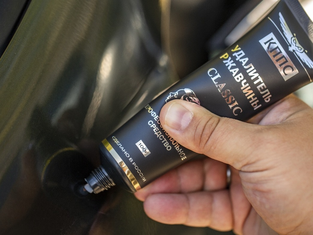 Закончив с обработкой, приступаем к осмотру внешних кузовных деталей. Сколько не береги, а сколы и ссадины на дверях и крыльях, стойках и том же капоте с багажником обязательно появятся — следы эксплуатации. То дверь в соседней машине распахнется слишком сильно, то камешек прилетит, то ветка упадет, то дворовый кот, взбираясь на теплый автомобиль, расцарапает. Если повреждение пробило и лакокрасочный слой, и грунт, то голое железо очень быстро покроется тонкой пленкой ржавчины, которая в свою очередь очень оперативно приведет к сквозной коррозии. Чтобы этого не случилось, поврежденный участок стоит обработать специальными составами — удалителями ржавчины. Тот же КППС известен в России именно таким составом: удалителем ржавчины КППС ORIGINAL, который, будучи профессиональным составом, позволяет эффективно растворить не только лёгкий налёт, но и стойкие окалины до 3 мм. Важным отличием именно этого состава от конкурентов является консистенция: он густой, что позволяет наносить на вертикальные поверхности и не бояться стекания. Кроме пасты в банке производитель предлагает еще гелевый удалитель ржавчины КППС Classic в тюбике.
