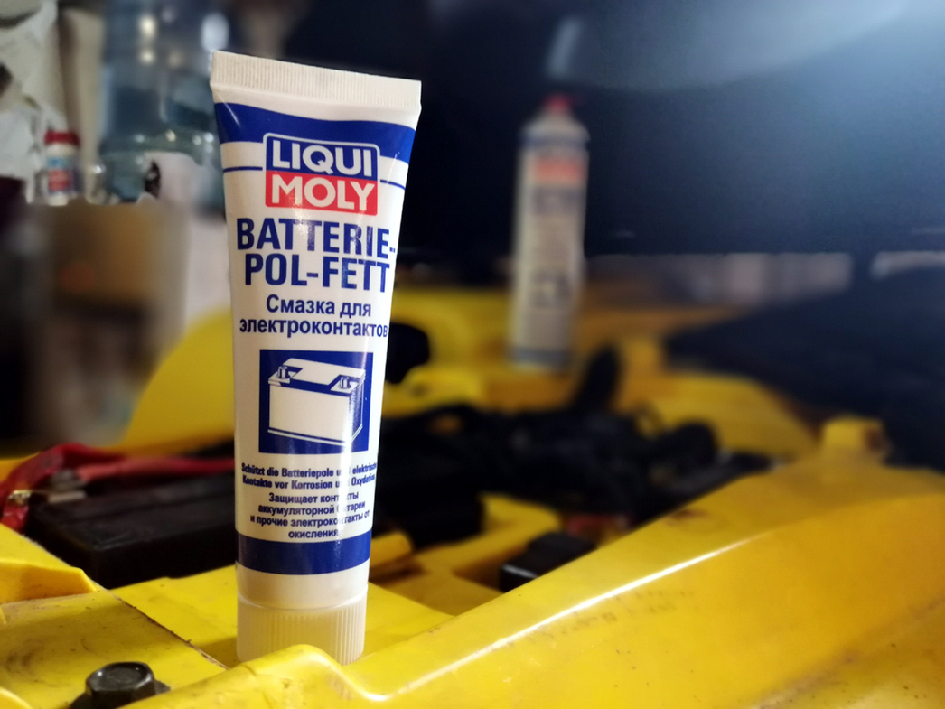 Согласитесь, со стороны это зрелище выглядит довольно странно. А ведь чтобы не заниматься «рукоприкладством», достаточно нанести на клеммы аккумулятора немножко густой консистентной смазки для электроконтактов Liqui Moly Batterie-Pol-Fett. Состав предотвращает коррозию, повышая стабильность и надежность работы аккумулятора.