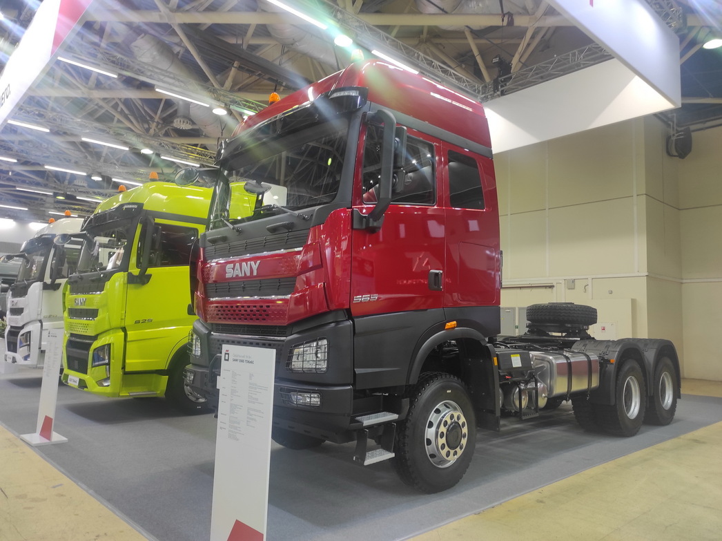 Особняком стоял полноприводной тягач Sany S565 для 80-тонного автопоезда. В отличие от конкурентов, у него собственный выбор агрегатов: 13-литровый 557-сильный дизель Deutz и 9-тонный подключаемый передний мост Fangsheng. И запас топлива уже вполне приличный: 800 л в двух баках.