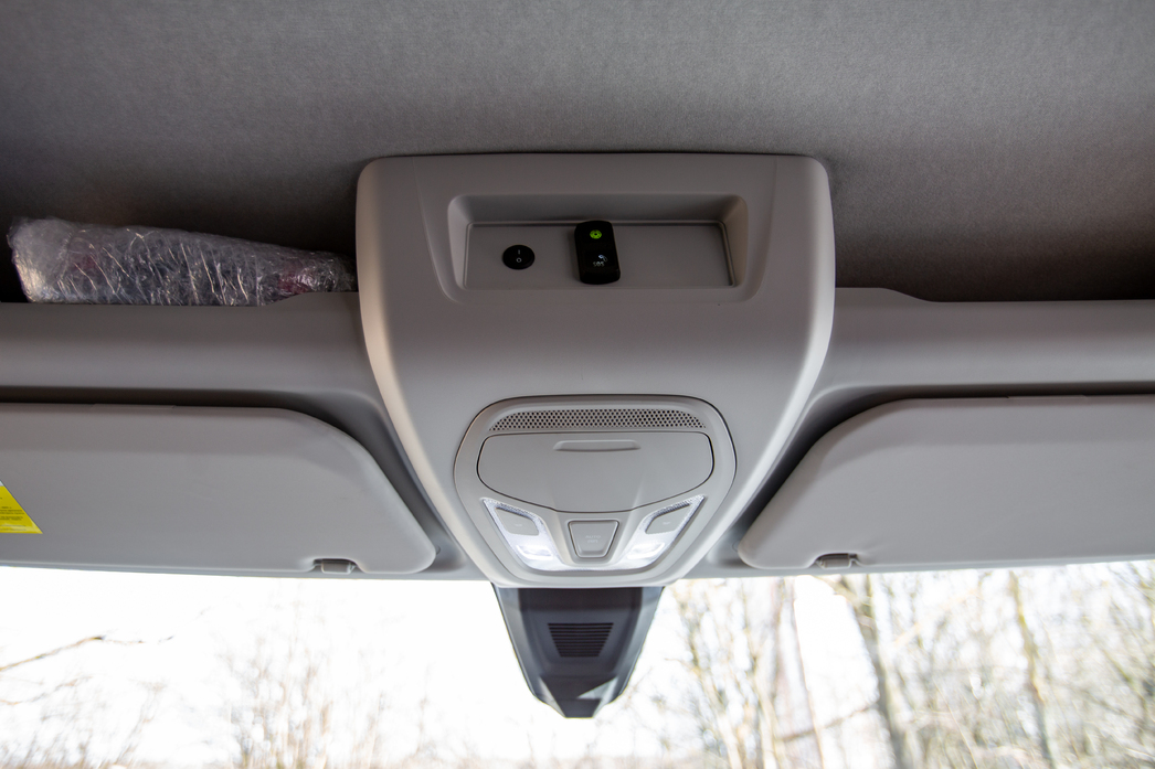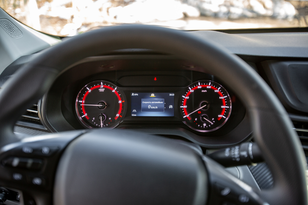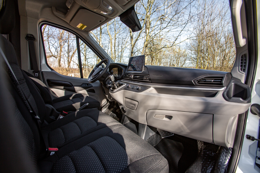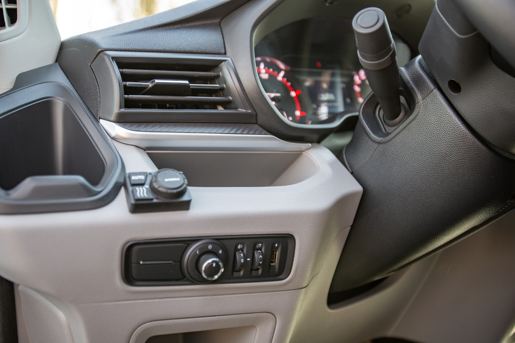 В салоне достаточно удобно, хотя руль по вылету не регулируется — только по наклону, кресла приличные — спина на коврик не вываливается даже после четырех часов за рулем, про полочки и подстаканники производитель не забыл. Разве что не хватает места для так любимых логистами папок и бумаг, но «антресоль» над водителем теоретически с такой задачкой справится.