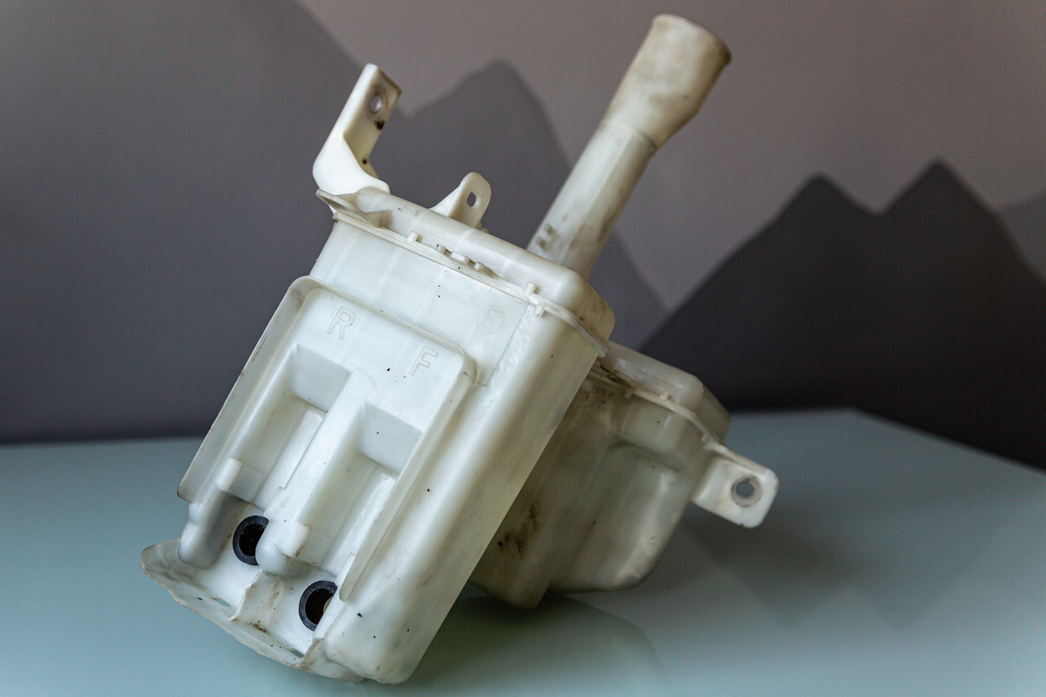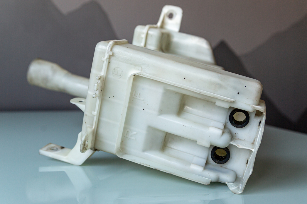 Снятие бачка подтвердило наши догадки: решето. Обычно бачок, который в нашем случае стоит впереди, прямо под бампером, приходит в негодность от столкновения, но в конкретно ситуации виновником неудобств и трат стал генерал Мороз. Залитая прошлым владельцем вода превратилась в лед и разнесла резервуар буквально в щепки: стыки, рельефные места и прочие изгибы покрылись паутиной трещин, сквозь которые незамерзающая жидкость вытекала полностью за несколько секунд.