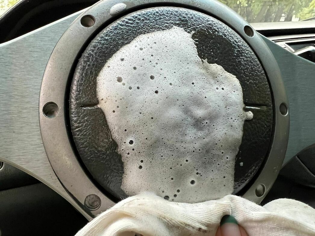 Судите сами: первая же обработка рулевого колеса пенным составом показала, что внутри пор и перфораций скрываются килограммы грязи, накопленных за 18 лет эксплуатации. Пена становится бурой за секунды, вытягивая жир, но просто смахнуть моющее средство недостаточно: следующее нанесение картины не меняет.