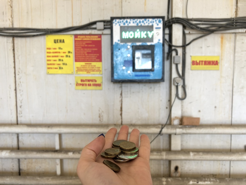 Я и раньше бывала на подобных станциях (исключительно в качестве зрителя) и потому знаю, что в аппараты на мойках самообслуживания лучше «загружать» мелочь. Смотрим прайс: 1 минута подачи воды — 15 рублей. Хорошо, отправляю в монетоприемник две десятки. Этого должно хватить, чтобы ополоснуть авто перед нанесением моющего средства. Итак, у меня есть 1 минута и 20 секунд — поехали!