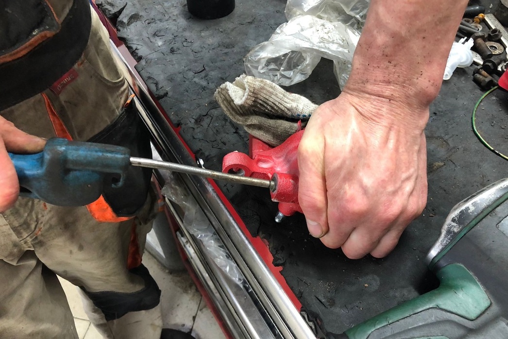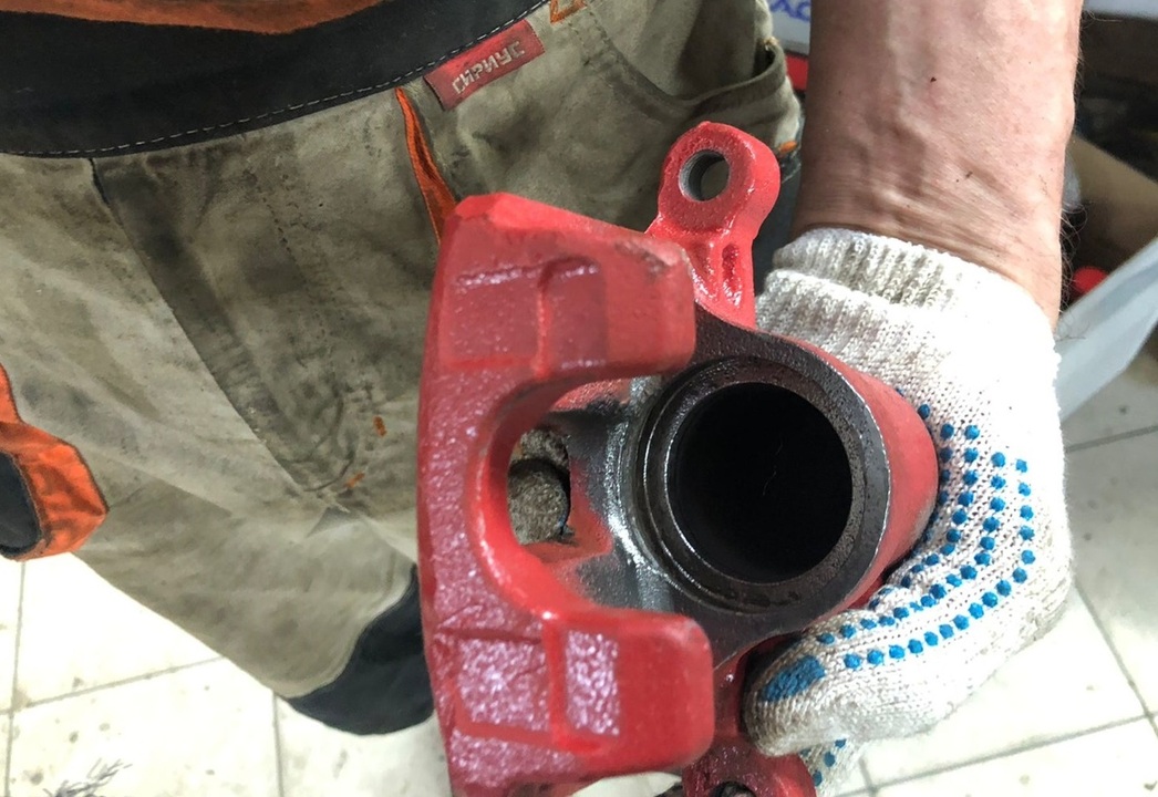 Далее разбираем суппорт: он представляет собой кусок «чугунины», где находится цилиндр с поршнем, являющиеся на пару основным «движущим элементом», а также небольшой клапан — в нем происходит прокачка тормозов. Клапан этот нужно регулярно менять: он имеет свойство забиваться, гнить, а после — просто ломаться, вследствие чего приходится высверливать негодные остатки, а порой и менять суппорт целиком.