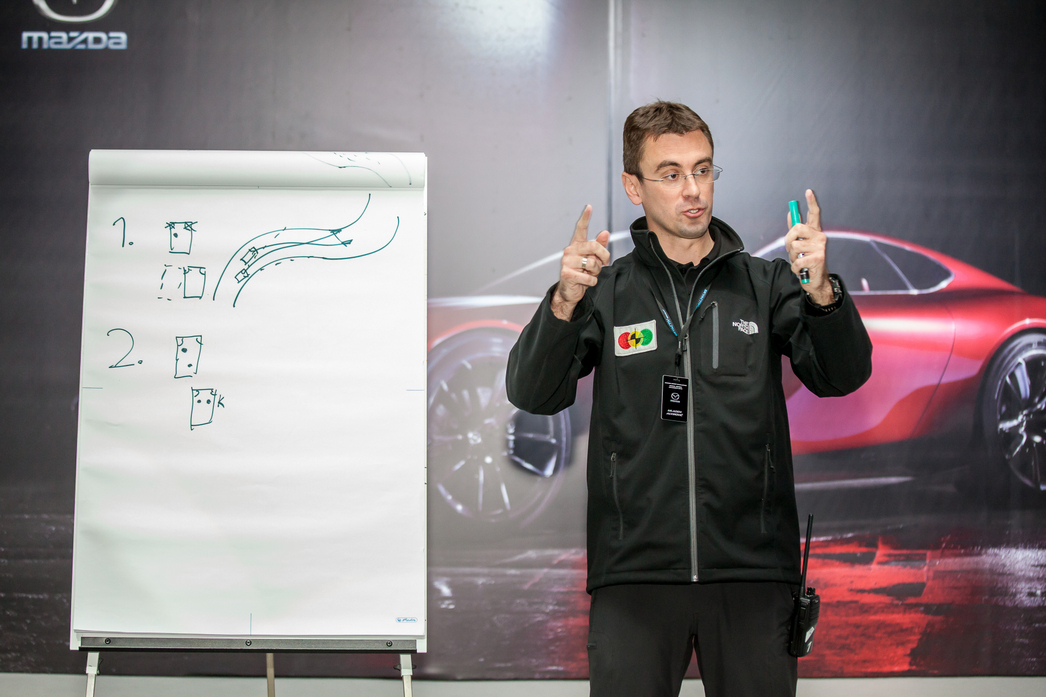 Но если в тактико-технических характеристиках и способностях своих автомобилей, как и в их надежности, Mazda уверена, то качество подготовки «рулевых» – даже для «овощной» езды – в нашей стране оставляет желать лучшего. А что уж говорить об их навыках и умениях в нестандартных ситуациях? Эта проблема, кстати говоря, волнует многих обосновавшихся на российском рынке автопроизводителей. Премиальные марки решают ее, организовывая многоступенчатые курсы контраварийной подготовки, ряд относительно бюджетных брендов серьезно вкладывается в работу с начинающими водителями и курсантами автошкол. Mazda же, как водится у японцев, создала в этом деле целую философию. Ее составляющие – проекты Mazda Karting Academy, Skyactiv Challenge, Mazda Sport Challenge и Mazda Driving Academy, в которых, по сути, может принять участие любой владелец машины бренда. Я же проходил «курс молодого бойца» в рамках последней.
