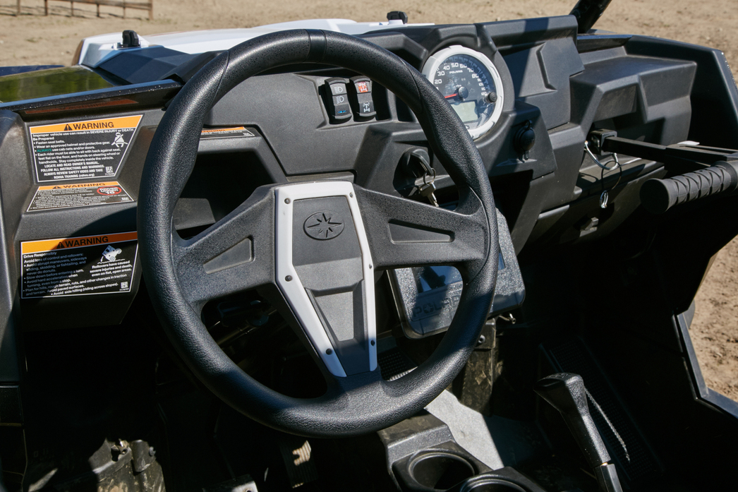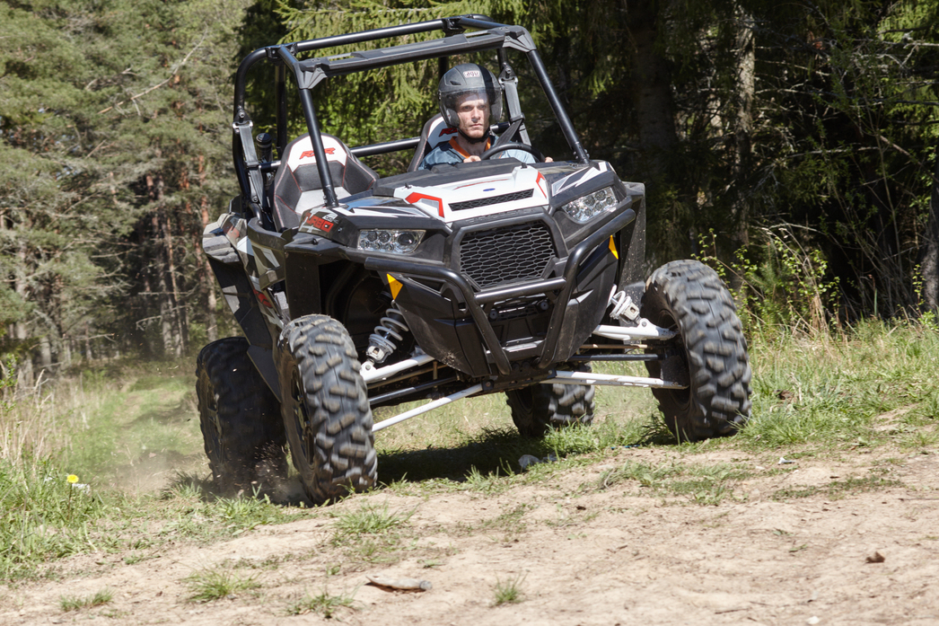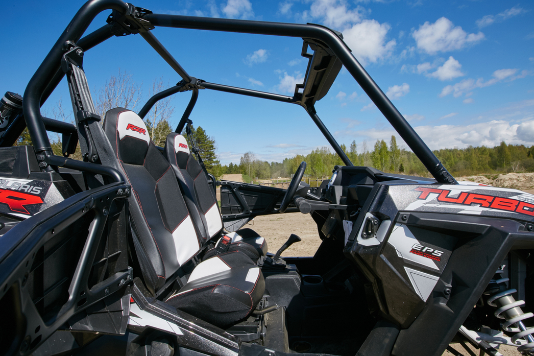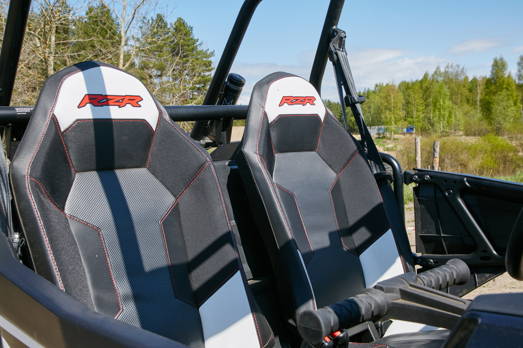 Но буклет с техническими характеристиками Polaris RZR Turbo можно отложить в сторону и перейти к практической части знакомства. Спортивные сиденья-ковши не отличаются повышенной мягкостью, но и вместе с тем нет и ощущения, будто ты сидишь на пластмассовом жестком стуле. Некоторые коллеги жаловались, что у вездехода странная и местами даже неудобная посадка, что педали расположены чересчур близко друг к другу, но мы ничего подобного не выявили. Даже напротив, поколдовав немного с настройками рулевой колонки и сиденья, возникло чувство, будто машину сделали конкретно под тебя.