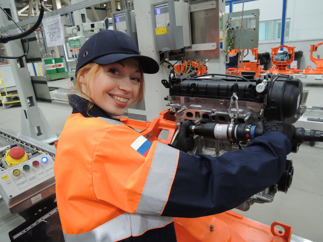 На мой вопрос, как здесь работается, Зульфия ответила: «Чисто, красиво, очень комфортно и тихо, но на соседнем заводе я раньше собирала Ford Transit, там конечно поинтереснее было. Могу вручную целый фургон собрать». Да, сразу же вспоминаются и «горящая изба», и «конь на скаку»... Кстати, прямо в центре цеха расположены зоны отдыха для рабочих — кухня с микроволновкой, кулеры с водой, шкафчики, столы и скамьи. В большой столовой можно вкусно и сытно поесть чуть больше, чем за 100 рублей. Движение транспорта и пешеходов в цехах осуществляется строго по разметке, словно на улице, есть даже светофоры и перекрестки. Все сотрудники ходят в одинаковой яркой сине-оранжевой униформе со светоотражающими полосками.