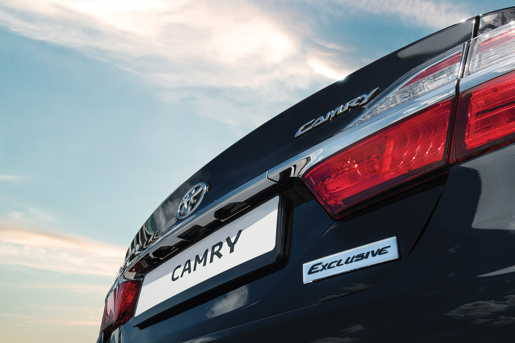 Снаружи Camry Exclusive можно отличить от прочих версий по особому дизайну 17-дюймовых дисков и по эмблеме специальной серии на крышке багажника. Салон автомобиля выдержан в коричневых тонах, сиденья отделаны высококачественной кожей и украшены контрастной прострочкой. За основу версии взята комплектация «Элеганс Плюс», включающая такие опции как двухзонный климат-контроль, ксеноновые фары, электропривод сидений и зеркал и беспроводная зарядка мобильного телефона.