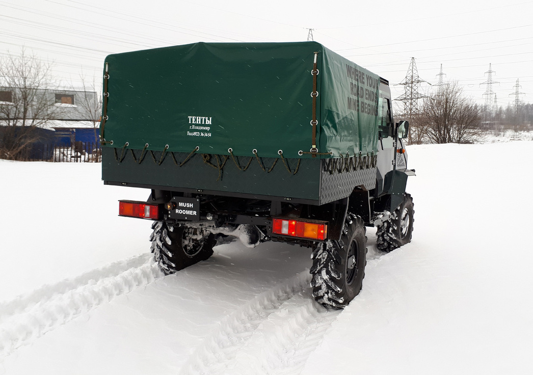 В основе Mushroomer — рама от UAZ Hunter, у которой усилили элементы крепления узлов и агрегатов. А сердцем машины стал тракторный трехцилиндровый турбодизель воздушного охлаждения производства Владимирского моторно-тракторного завода. Мощность — 80 л. с., максимальный момент — 250 Н. м. при 1200 об/мин. Забегая вперед, скажем, что с низов мотор действительно тянет, как паровоз.