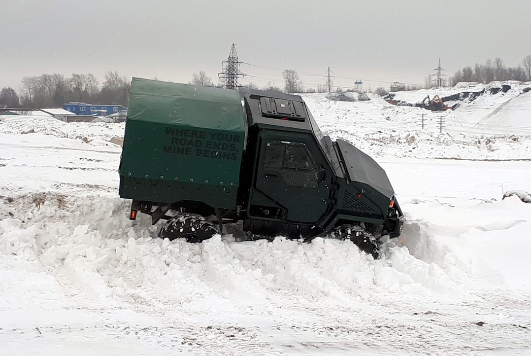Лазает вездеход отменно. Глубокий снег и крутые косогоры ему нипочем. Угол въезда — 52 градуса, а дорожный просвет — 410 мм. Не последнюю роль играют и ведущие мосты. Они — собственная разработка компании (да и вообще, отметим, 97% узлов и агрегатов у вездехода отечественные).