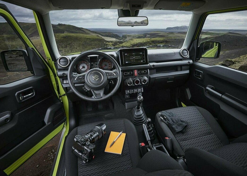 В топе Jimny получит светодиодные фары с автокорректором и омывателем, климат-контроль и информационно-развлекательную систему с навигацией и возможностью подключения смартфонов, а также целый букет прочих удобностей, включая розетку на 12В и органайзер в багажнике.