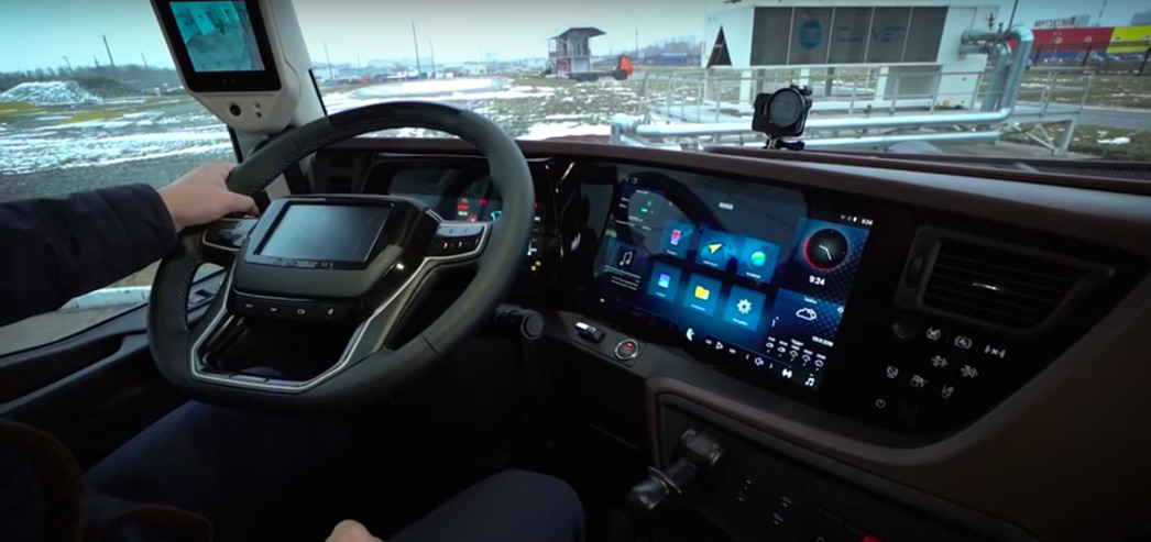 Новый грузовик получил систему автопилотирования третьего уровня, то есть он умеет без помощи водителя ехать по прямой, перестраиваться в соседнюю полосу, двигаться в колонне и парковаться. Боковых зеркал, как таковых нет. Их заменили камеры, откуда картинка выводится на два экрана на передних стойках.