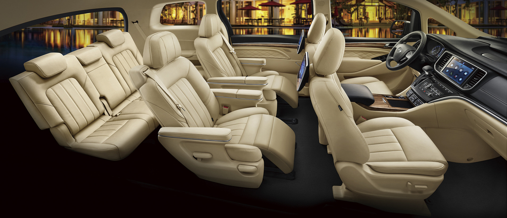 Семиместный минивэн позиционируют, как премиальный автомобиль для бизнеса и больших семей. Второй ряд кресел раздельный, а третий представляет собой полноценный диван. Все сиденья обтянуты кожей, есть массаж, вентиляция и обогрев. А у кресел второго ряда предусмотрена даже поддержка для ног.