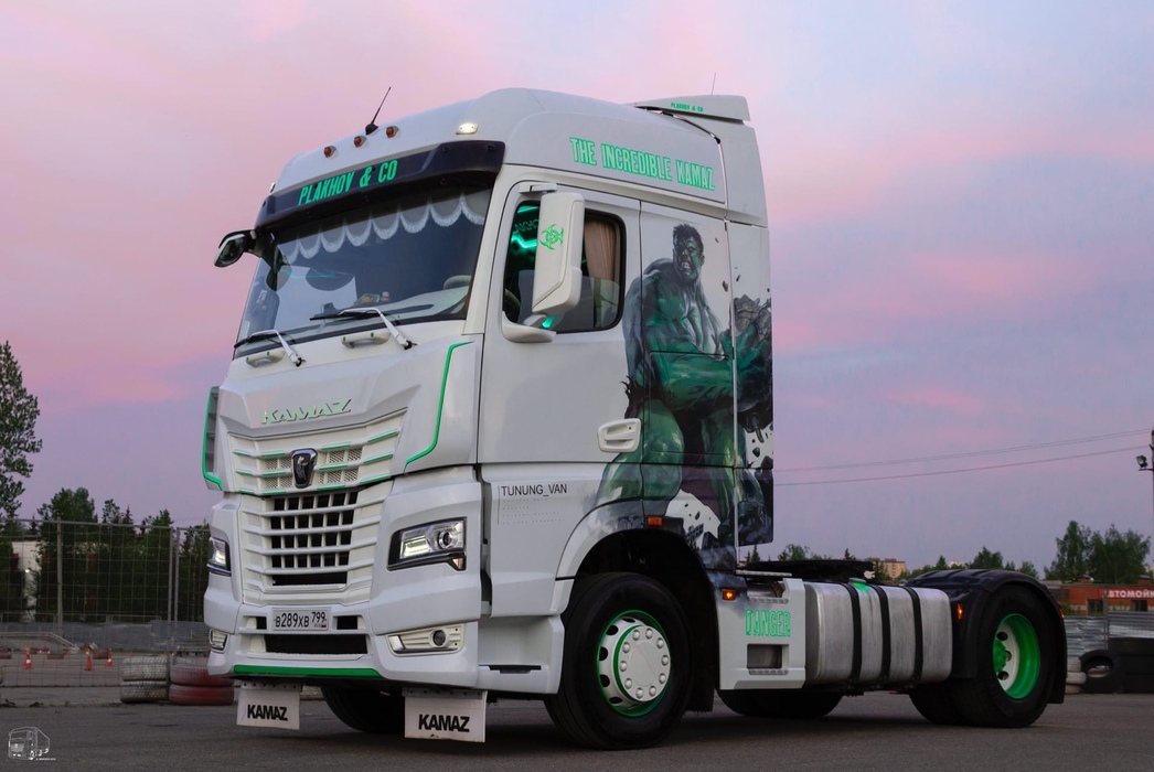 В Сети активно обсуждают переделку магистрального тягача КамАЗ-54901, которую создатель и владелец именует «Халком» — супергерой комиксов издательства Marvel изображен на кабине грузовика.