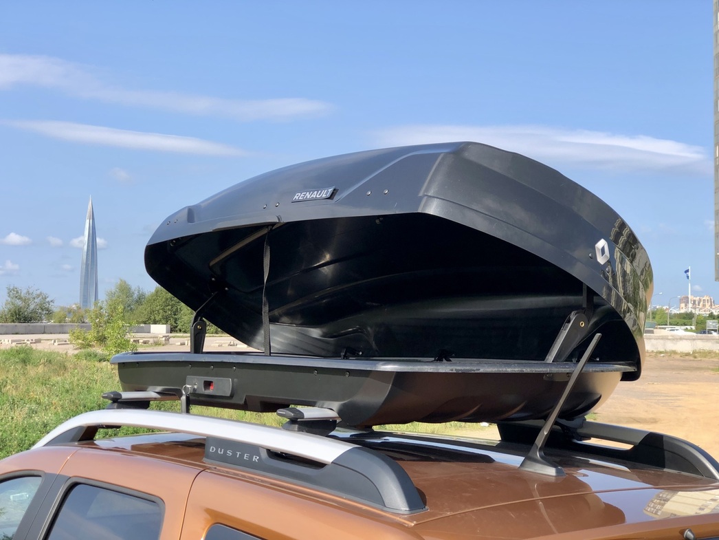 За сохранность вещей можно не переживать, поскольку бокс запирается на ключ. И, кстати говоря, открывается он в обе стороны, то есть погрузкой можно заниматься, как со стороны водителя, так и со стороны тротуара. А поклажу в багажнике легко крепить ремешками, которые входят в комплект. Кстати, вот вам еще одно интересное наблюдение: Duster с боксом на крыше отлично видать издалека. Это оказалось удобно на забитых автомобилями больших парковках около супермаркетов.
