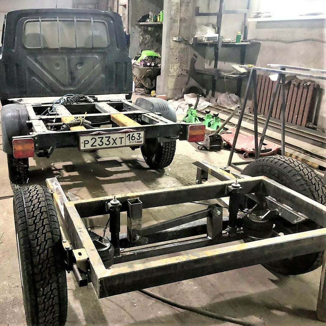 Конструкция «трехосника» проста и элеганта: в заднюю полураму вставляется специальный полуприцеп, у которого есть подкатная ось. На выходе получается автомобиль способный перевозить грузы длиной до 3 100 мм — то есть своеобразный конкурент короткобазной «Газели».