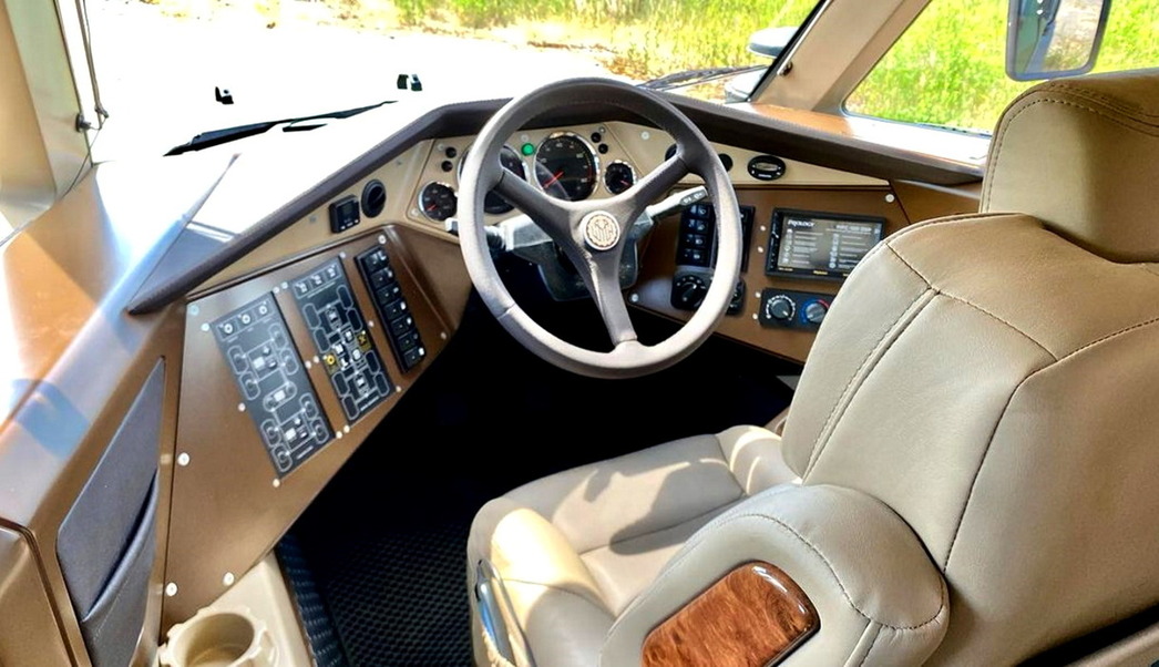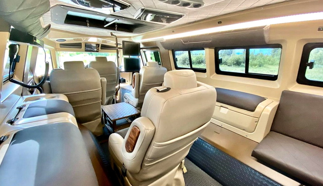 В новой версии модель оснастили роскошными кожаными креслами, а интерьер отделали дорогостоящими материалами. В такой конфигурации вездеход способен принять троих пассажиров и водителя. Кроме того, в задней части салона имеется пара обычных скамеек, если экипаж захочет пригласить еще четверых гостей или… спутниц.