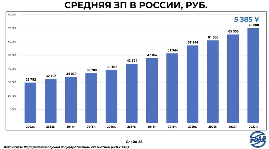 Согласно тем данным Росстата, на которые предпочла сослаться РОАД, средняя зарплата по России в 2019 году составляла 51 344 рубля. К 2023-му она чудесным образом выросла аж до 70 000 — то есть, на 36%. Очень хочется предложить экспертам Федеральной службы государственной статистики съездить куда-нибудь в Инту или в Кинешму и там поискать счастливых обладателей подобных доходов.