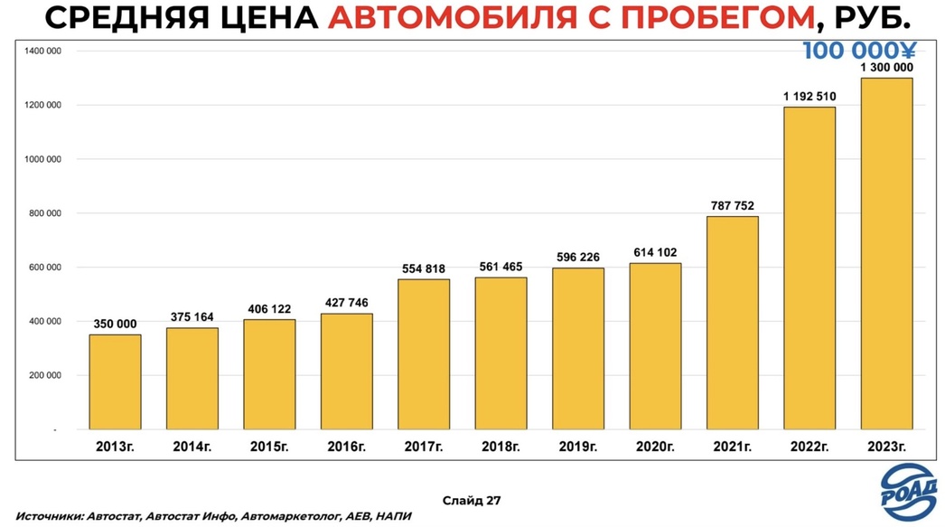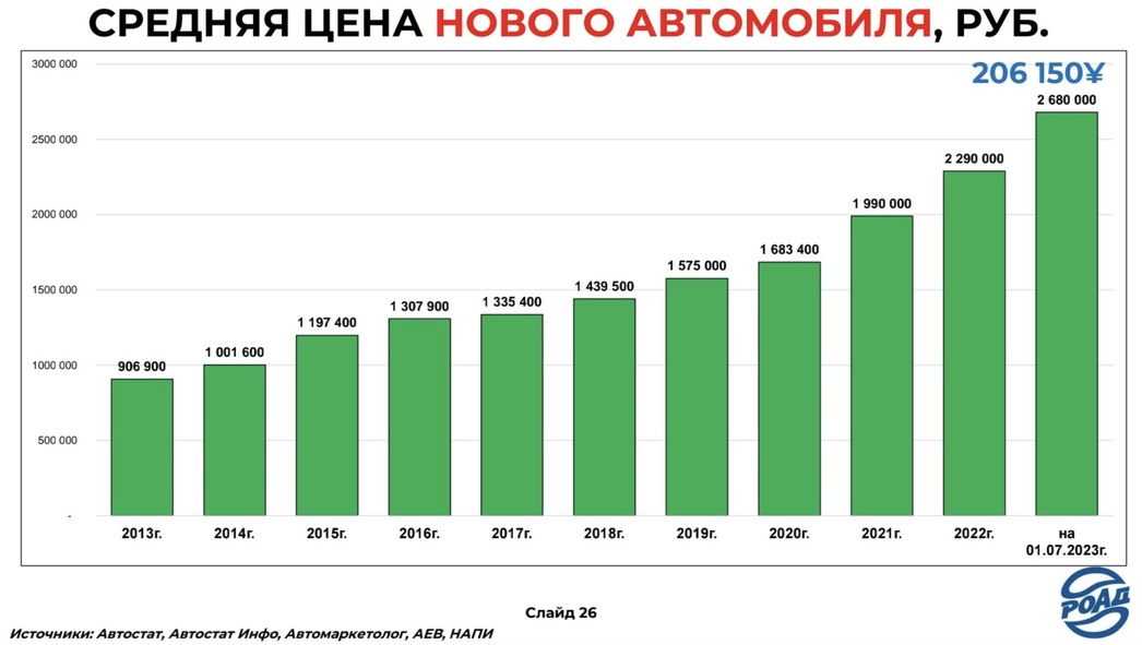 Параллельно РОАД сообщает, что средняя цена на новые автомобили в России за тот же самый период подскочила с 1 575 000 до 2 680 000 рублей — на 70%. И это, заметьте, уже совсем не те машины, которые продавались в нашей стране четыре года назад: «Лондоны-Парижи смазали лыжи, царю остались послы пожиже».