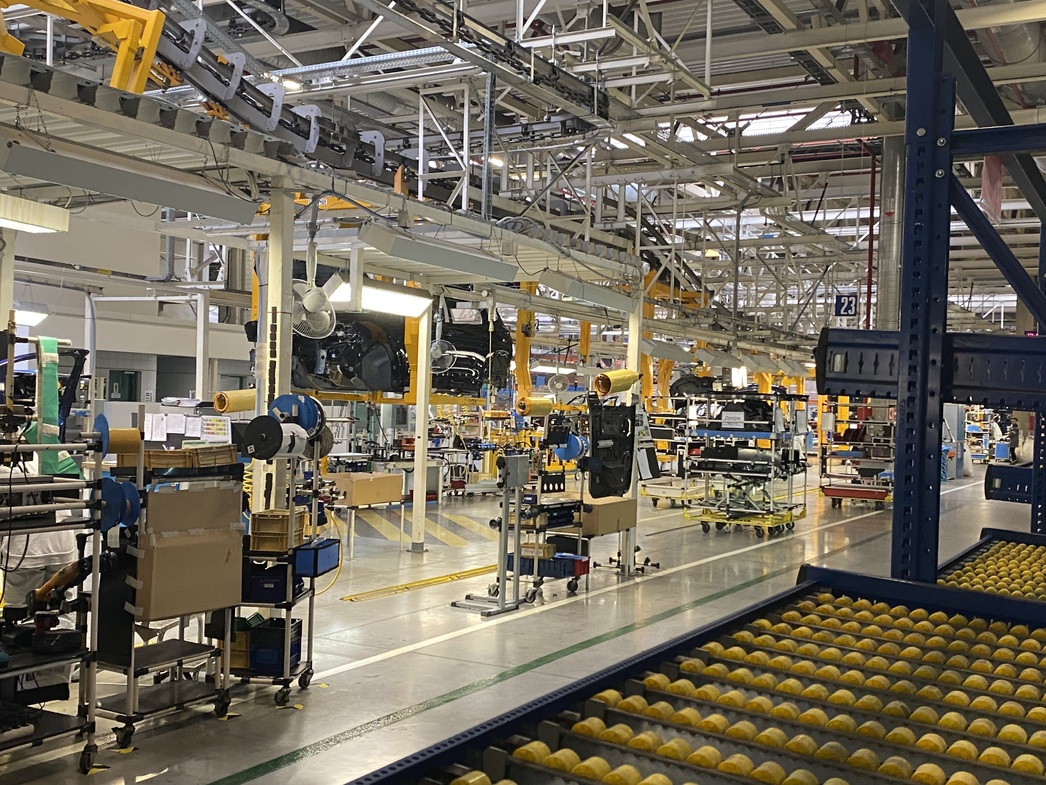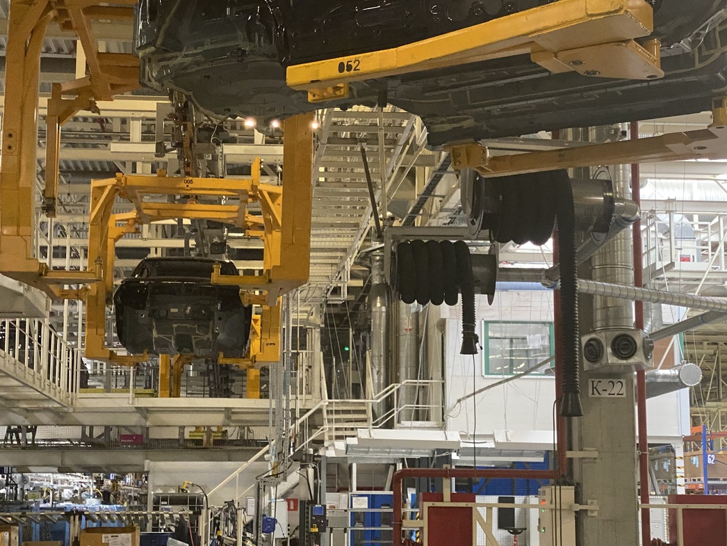 Как ни странно, но калужская сборка представляет собой не «прикрутили четыре колеса гайковертом», а более серьезные и глубокие процессы. На завод поступают окрашенные кузова, а все остальное инсталлируется уже руками отечественных рабочих на 78 постах. Конвейер, на первый взгляд, проходит некоторую обкатку: захваты с кузовами чередуются с пустыми ячейками, повсеместно развешаны подсказки с периодичностью операций, сотрудников — всего 121 человек. Да и машинокомплектов на данный момент лишь сотня.