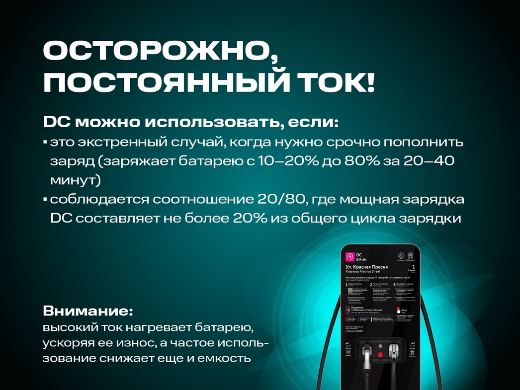 «AC-зарядка (переменный ток) — медленно, но полезно. Ток идет через встроенный в авто контроллер, который бережно распределяет энергию. DC (постоянный ток) — быстро, но с высокими для батареи токами. Постоянные DC-зарядки могут сократить срок жизни аккумулятора, поэтому ими лучше пользоваться только в дороге», — объясняет Николай Бабинов, продакт-менеджер бренда SMARTWATT.