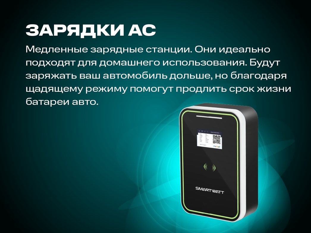 - Домашние (AC, ~3-22 кВт) — медленные, но щадящие батарею. Подключаются к обычной или трехфазной сети. ЭЗС бренда SMARTWATT относятся именно к такому типу.