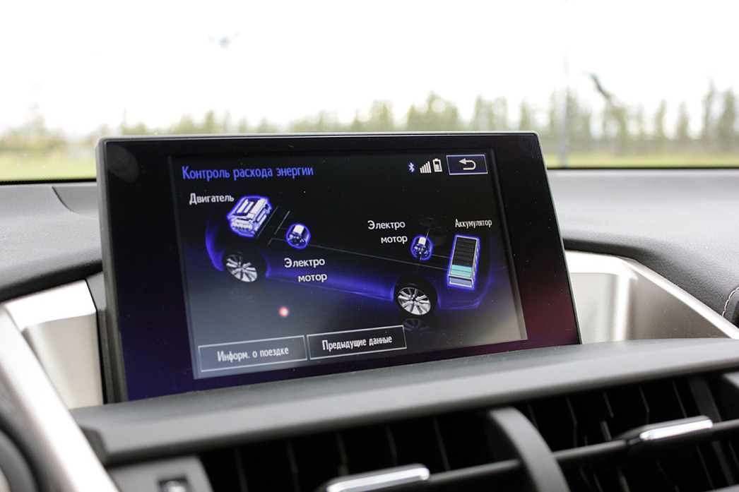 Но самое интересное начинается в тот момент, когда нажимаешь кнопку запуска двигателя: кажется, что мотор в обычном для нас понимании здесь полностью отсутсвует — в салоне полнейший акустический рай, MarkLevinson идеально «прокачивает» Pink Floyd, и лишь с набором скорости слышишь легкий шелест шин. А все оттого, что Lexus NX 300h — не просто бензиновая «повозка», а технологически сложный гибрид, вооруженный не только ДВС мощностью 155 л.с., но и парой электрических моторов (суммарно дают еще 42 «кобылы») — по одному на каждую ось. И управляется весь этот хай-тек при помощи какого-то колдовства: машина будто чувствует всеми своими электронными мозгами, когда вы поставили ногу на педаль газа, понимает, когда нужно ускориться. И сопровождается все это представление анимацией на центральном дисплее. Да так, что уже сам подсознательно начинаешь играть в «экологическое ралли». Что, собственно, абсолютно закономерно — 300h не создан для светофорных гонок. Хотя в этом кроется огромный плюс — все камеры контроля скорости, как ни старайся, обхитрить нельзя. Но все вышесказанное касается лишь режима Eco, когда педаль газа настолько задемпфирована, что отклик двигателя приходится ждать столетиями. Все меняется, как только переводишь селектор в режим Sport — руль наливается приятной тяжестью, подвеска становится жестче, практически не теряя энергоемкости, вместо «эконометра» на приборке сверкает тахометр, а мотор с удовольствием раскручивается до красной зоны. Соответственно, и сама динамика становится чуть не на порядок лучше: обгоны фур на трассе в таком режиме — плевое дело.