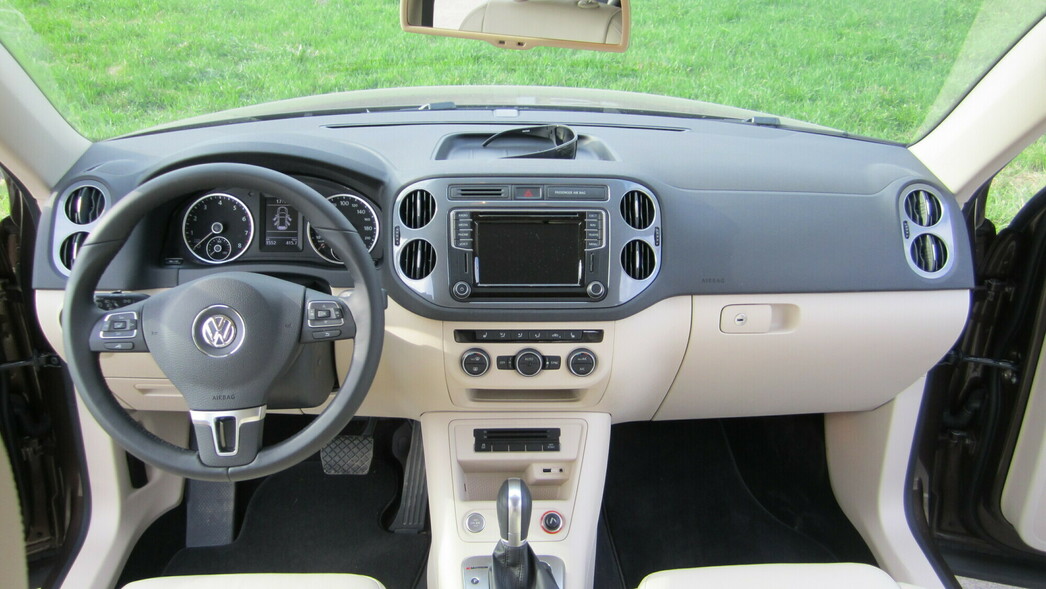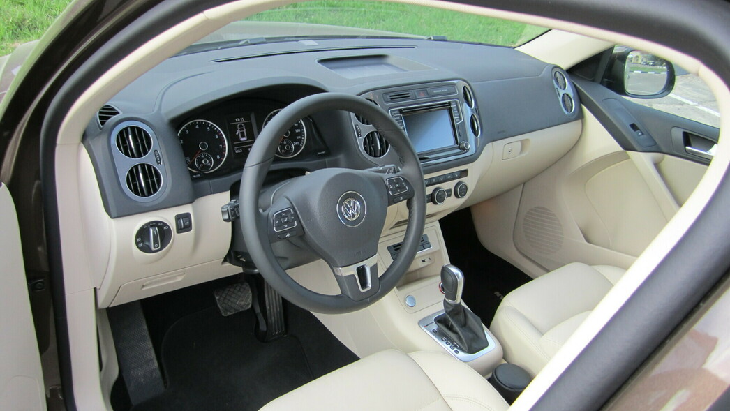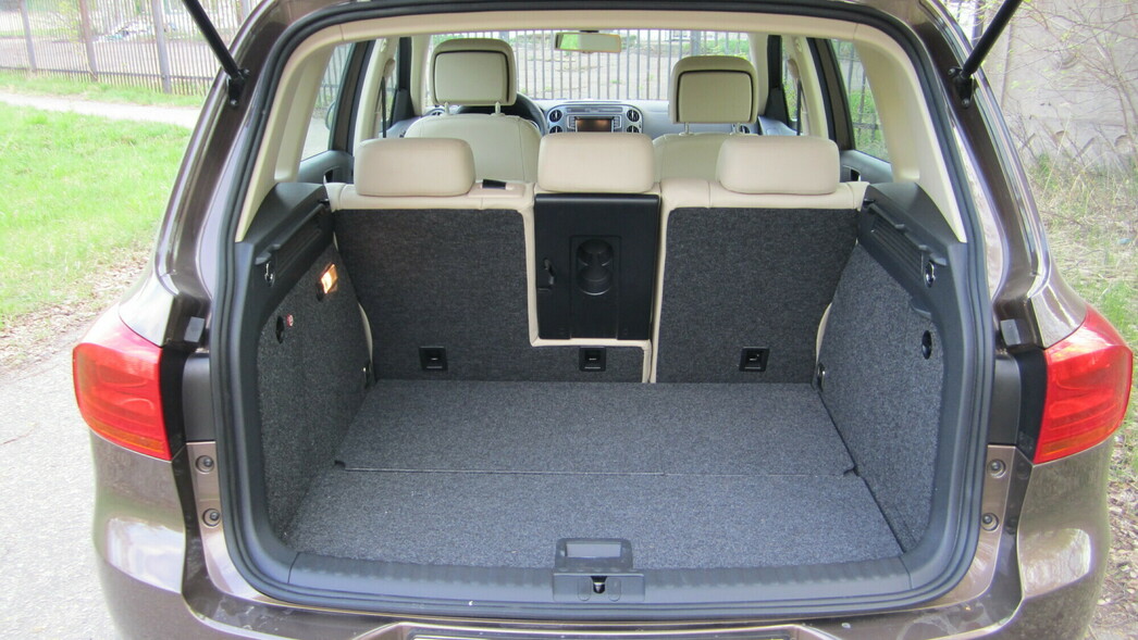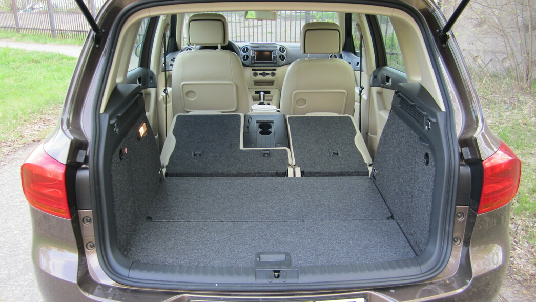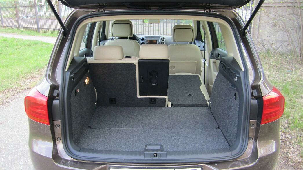 Не разочаровывает Tiguan и в плане эргономики. Разве что диапазоны регулировки рулевого колеса по высоте и вылету недостаточны, чтобы мне удалось устроиться в водительском кресле с полным комфортом. А еще хотелось бы зеркала заднего вида чуть покрупнее. Зато в остальном все отлично: качество материалов не оставляет желать лучшего, добротность и аккуратность сборки проявляется в мельчайших деталях — даже потолочные ручки и крышка очешника снабжены микролифтом. Багажник довольно вместителен, а при сложенных задних сиденьях его объем увеличивается втрое.