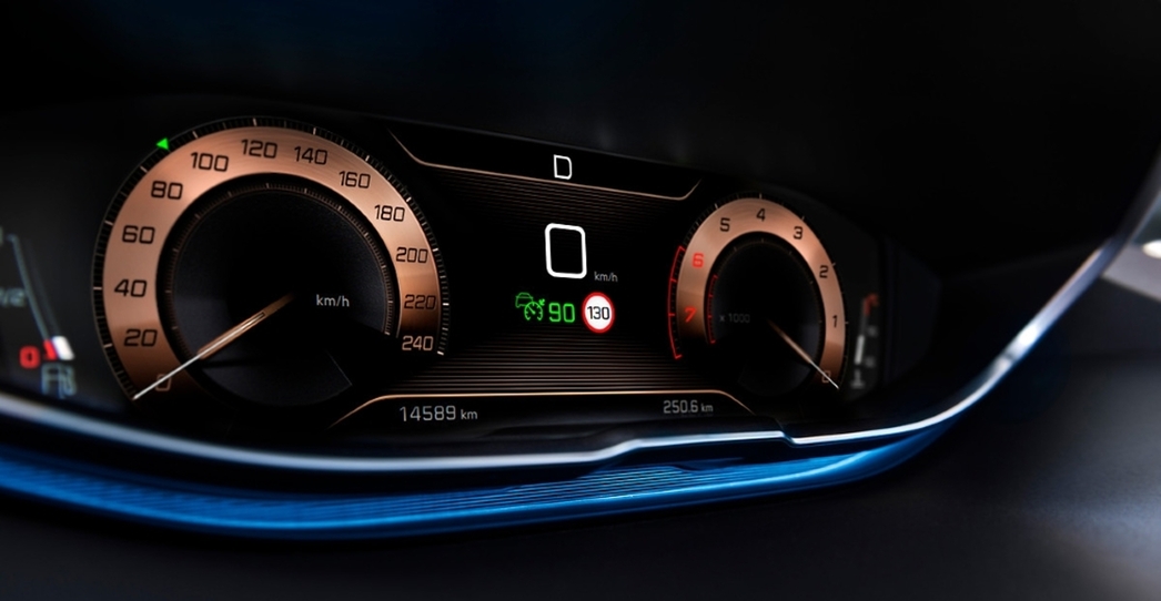Концепция оформления интерьера новой модели обозначена, как Peugeot i-Cocpit — это фактурные апартаменты в стиле жесткого хайтека, которые пестрят нестандартными решениями. Например, миниатюрный штурвал, «срезанный» не только снизу, но и сверху, имеет форму эллипса, а традиционные кнопки управления медиасистемой и различными функциями заменены двумя ровными рядами изящных клавиш, один из которых хромированный. За переключение трансмиссии здесь отвечает компактный джойстик нестандартной формы, низко заваленный вперед. Еще одно неожиданное решение — оригинальная серая ткань в средней части торпедо, сильно напоминающая джинсовую. Функцию панели приборов в новой модели выполняет объемный 12,3-дюймовый дисплей, широко растянутый по горизонтали. Единственной стандартной вещью можно считать 8-дюймовый монитор медиасистемы в виде планшета в верхней части торпедо.