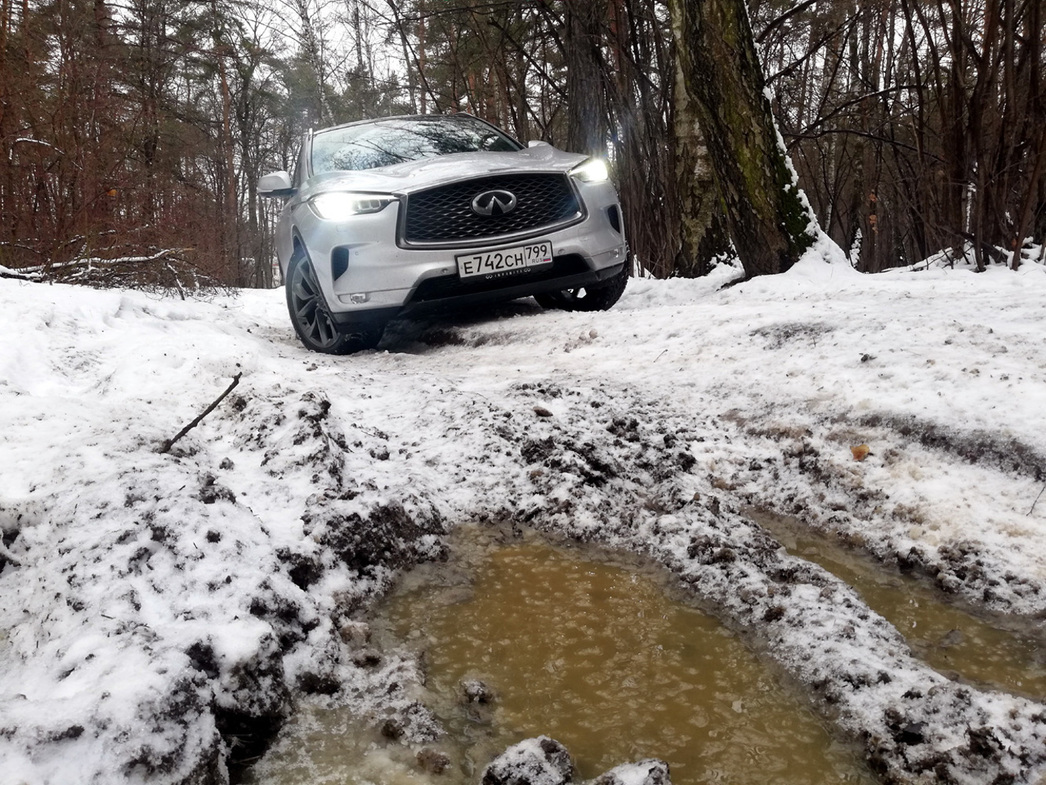 Принудительных блокировок, «понижаек» и прочих чисто джиперских атрибутов, разумеется, на QX50 не встретите. Да и большой грех на столь красивом автомобиле лезть в грязь. Однако если дорога к даче или месту отдыха на природе будет раскисшей, то можете не сомневаться — система AWD, которой вооружен «полтинник», оправдает возложенные на него надежды.