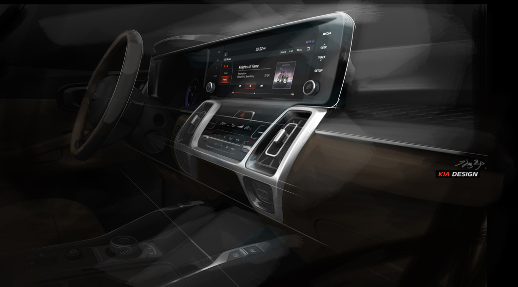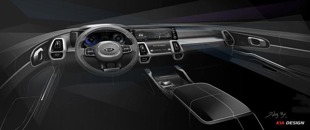В салоне Sorento свое место займет большой, горизонтально расположенный экран, разделенный на две части: левая несет функцию приборной панели, правая — монитора мультимедийной системы. Ожидается, что новинка будет габаритнее теккущей версии, а значит предложит больше пространства водителю и пассажирам.