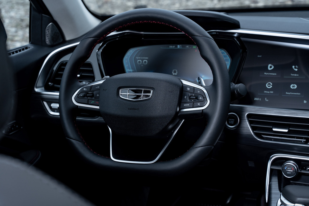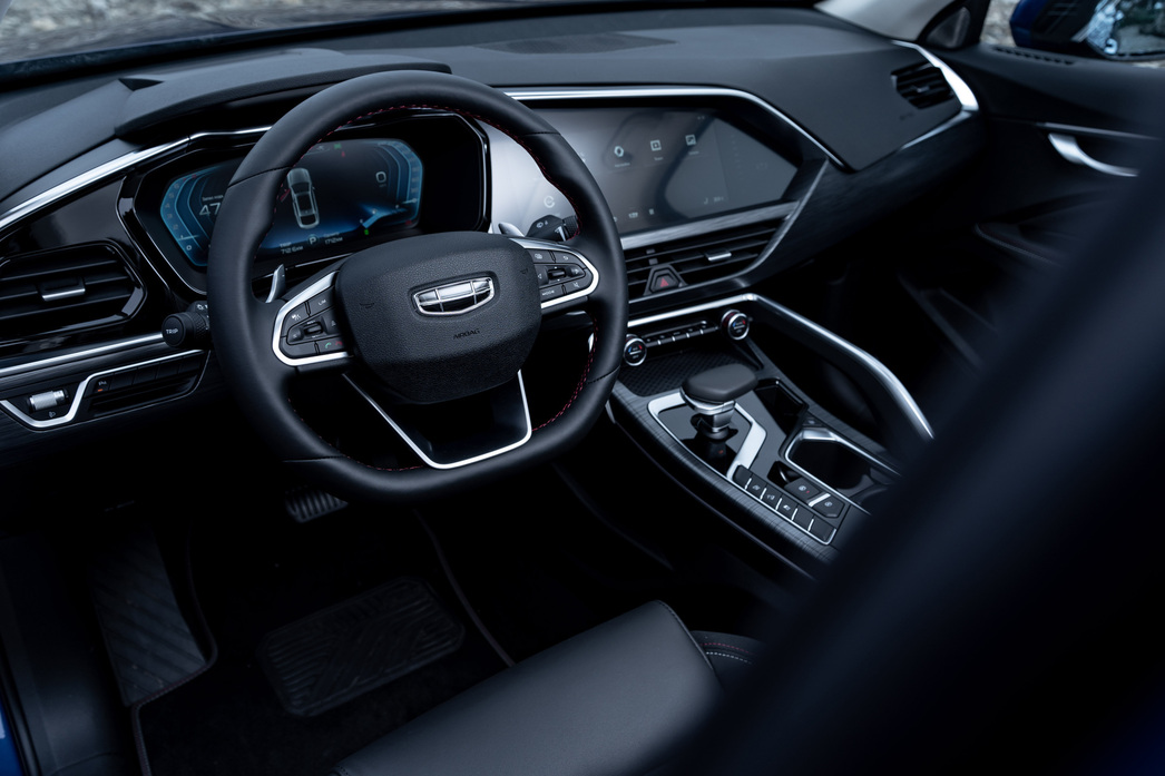 Внутреннее убранство Geely Tugella ни разу не отсылает к интерьеру азиатского автомобиля. Да и компоновка салона выверена до миллиметра. По крайней мере, устроиться на драйверском месте труда не составит. Если, конечно, вы не Сунь Минмин — знаменитый китайский баскетболист ростом под 2,5 метра. Под стать лучшим мировым образцам консоль развернута к пилоту, а 12,3-дюймовый тачпад мультимедиа поражает отменной графикой. Подружить головное устройство со смартфонами — плевое дело: пожалуй, даже называющим себя «премиалами» японским автостроителям определенно стоит взять у Geely пару-тройку практических уроков.