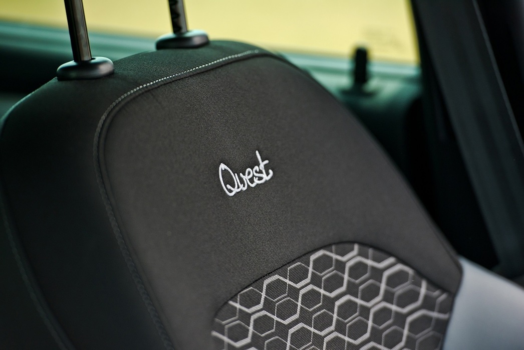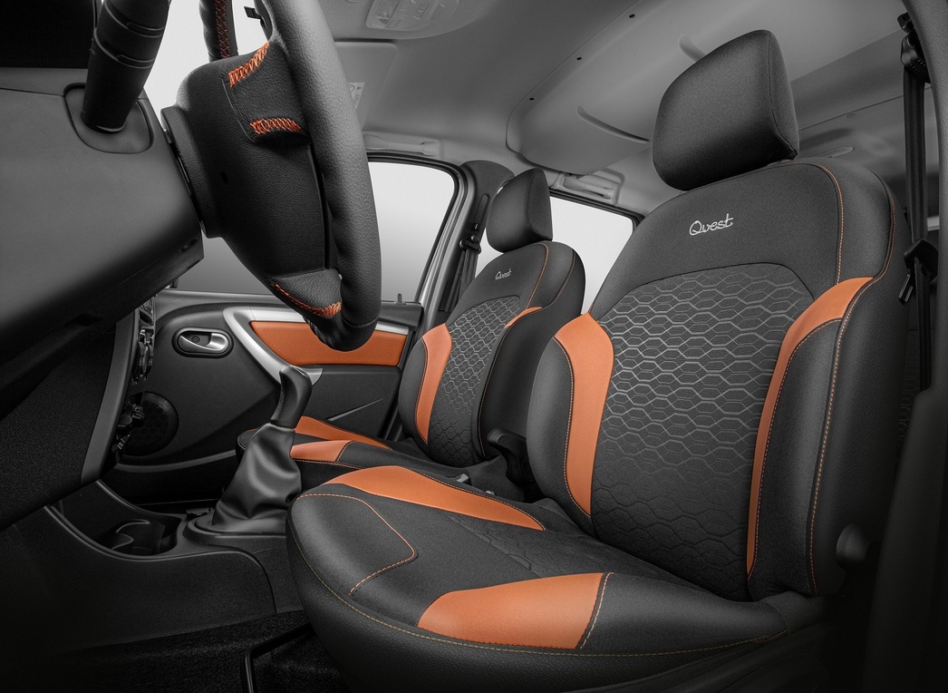 От обычных универсалов LADA Largus Quest отличают новые передние сиденья, улучшенная шумоизоляция, оригинальные колеса и черные корпуса зеркал. Вдобавок передние кресла имеют трехступенчатый подогрев, более развитый профиль и комбинированную обивку из ткани и экокожи. Завершает список переделок фирменная оплетка рулевого колеса.