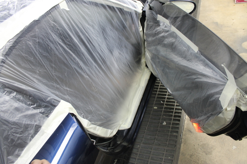 Все детали машины, которые не подлежат покраске, закрыли. В моем случае это были боковые, лобовое, заднее стекла (их закрывают и проклеивают малярным скотчем по периметру уплотнителей), арки и внутреннюю обшивку дверей, стекла и нижние части боковых зеркал, передние фары и задние фонари, колеса.