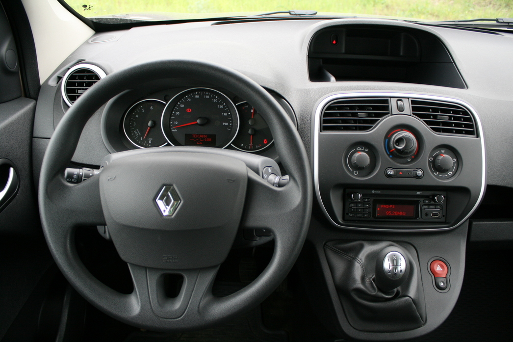 Если, сидя на водительском месте Kangoo не поднимать глаз от уровня горизонта, ничего особо «комтрансовского» не заметишь. По большому счету, лишь «табуреточная» посадка да широченное лобовое остекление на что-то подобное слегка намекают. В остальном все выглядит и работает примерно также как и в прочих бюджетных «реношках». И приборная доска, и блок управления климатом, и магнитола, с фирменными управлением «музыкой», притулившимся к рулевой колонке – все среднестатистически удобно и симпатично, ничего особенного. Разве что рычаг стояночного тормоза тут не вполне обычный: его Г-образная форма навевает ассоциации с рычагом управления двигателями в кабине авиалайнера.