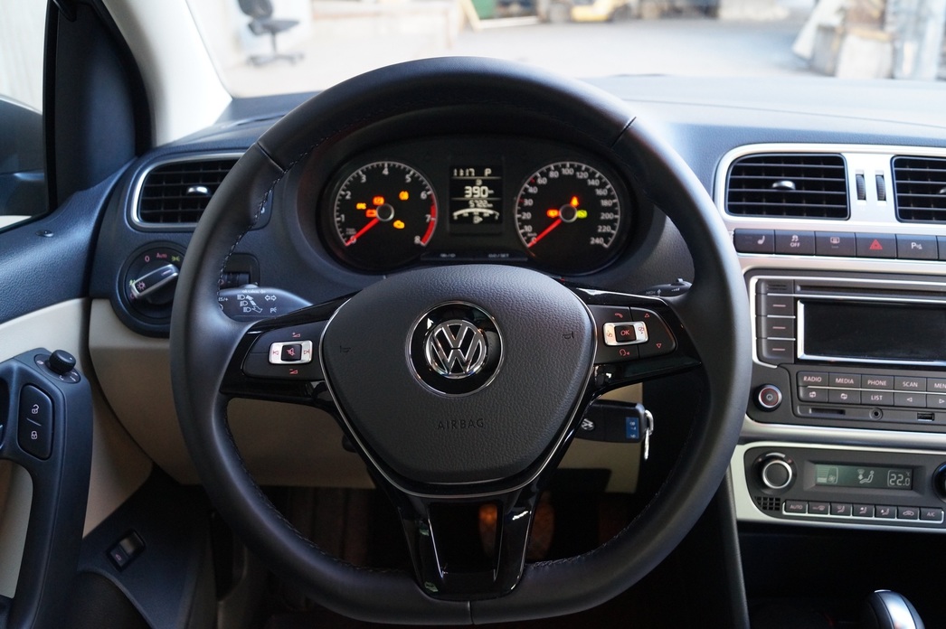Первое, что бросается в глаза в салоне обновленного Volkswagen Polo – это рулевое колесо. Баранка стала не только многофункциональной, позволяющей управлять мультимедиа, но еще и а-ля спортивной, скошенной снизу. Подверглись легкой доработке элементы центральной панели, обретя матовую хромированную окантовку. Мониторчик остался прежним, но по сравнению с «логановским» его диагональ на пару дюймов больше. Венчают картину комбинированная отделка кресел и модные накладки на порогах – собственно, и вот весь фейслифтинг. К эргономике претензий нет, кроме одной – в подстаканники походная кружка или поллитровая бутылка не войдут, как ни старайся. Да и броский интерьер – это отнюдь не про «Фольксваген».