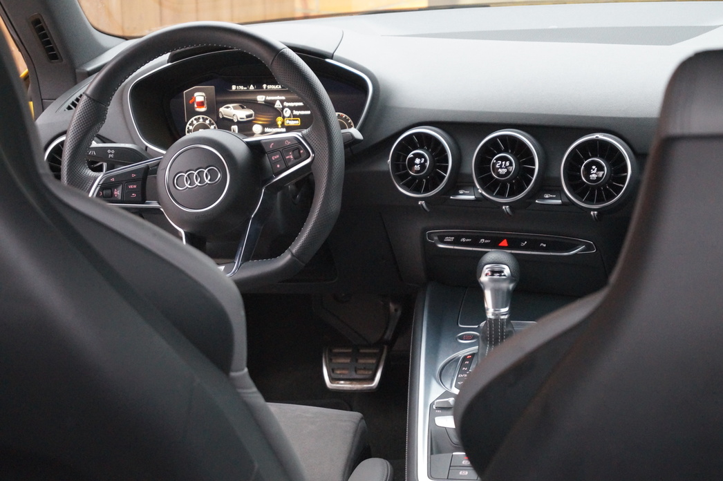 В салоне авто под стать эгоистичному нраву царит минимализм: нет тут ни створок на воздуховодах, ни привычного MMI-дисплея на центральной консоли, функции которого выполняет многоцветная графическая панель приборов, ориентированная исключительно на водителя. Наряду с ключевыми бортовыми показателями на ней отображается и навигация, и прочие мультимедийные функции. Надо сказать, это очень удобно, хоть и требует привыкания. Отсутствуют в салоне и всякого рода подогревы. С рулевым колесом понятно — в Ингольштадте даже и представить себе не могут, что найдутся отморозки, которые будут рассекать на «тэтэшке» зимой. «Тепленькое креслице» — вообще штука для «четких пацанов» неприемлемая: долго «прожаривать» пятую точку на сиденье урологи мужчинам не рекомендуют, так что делайте выводы!