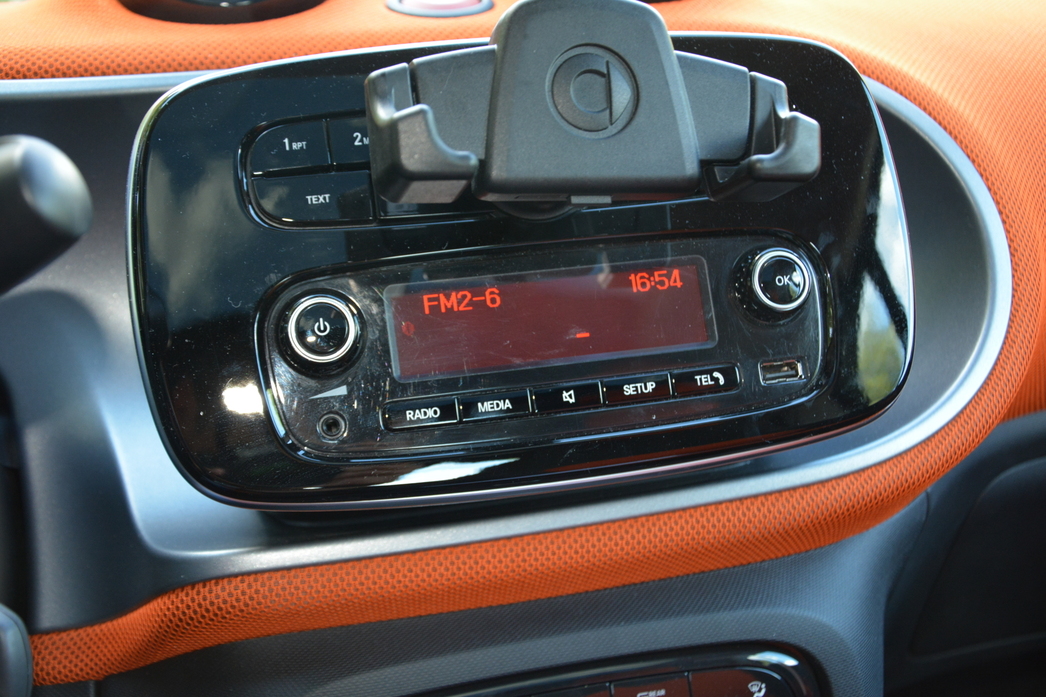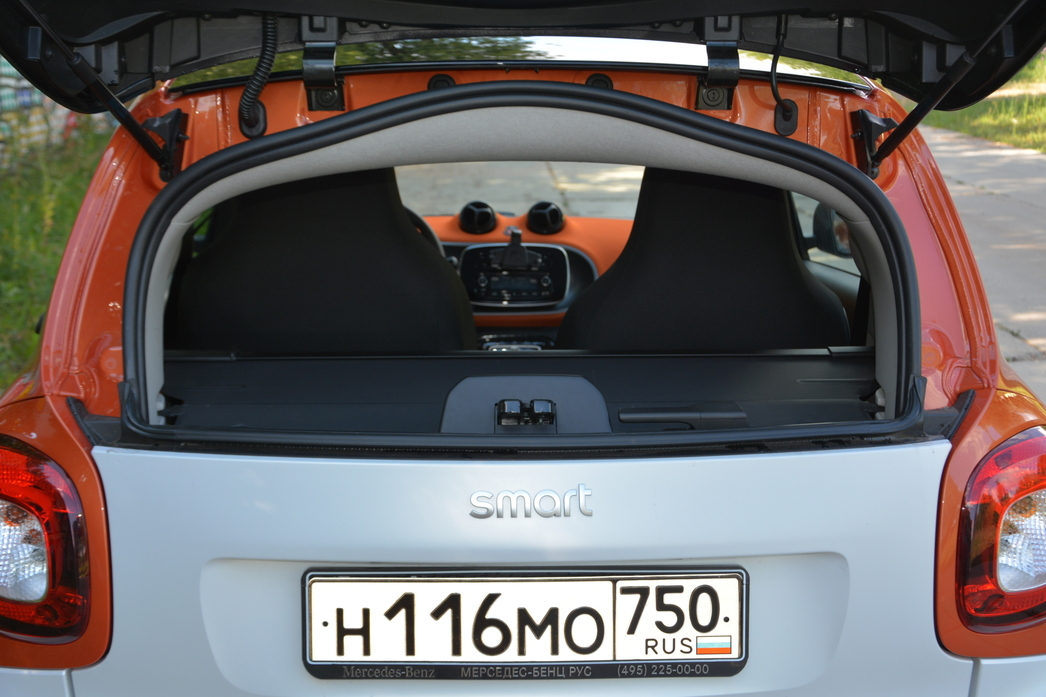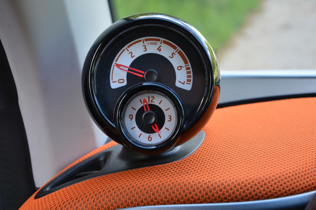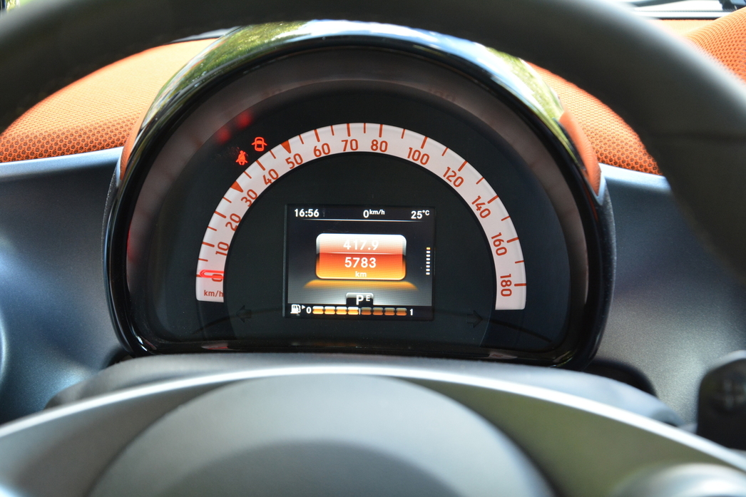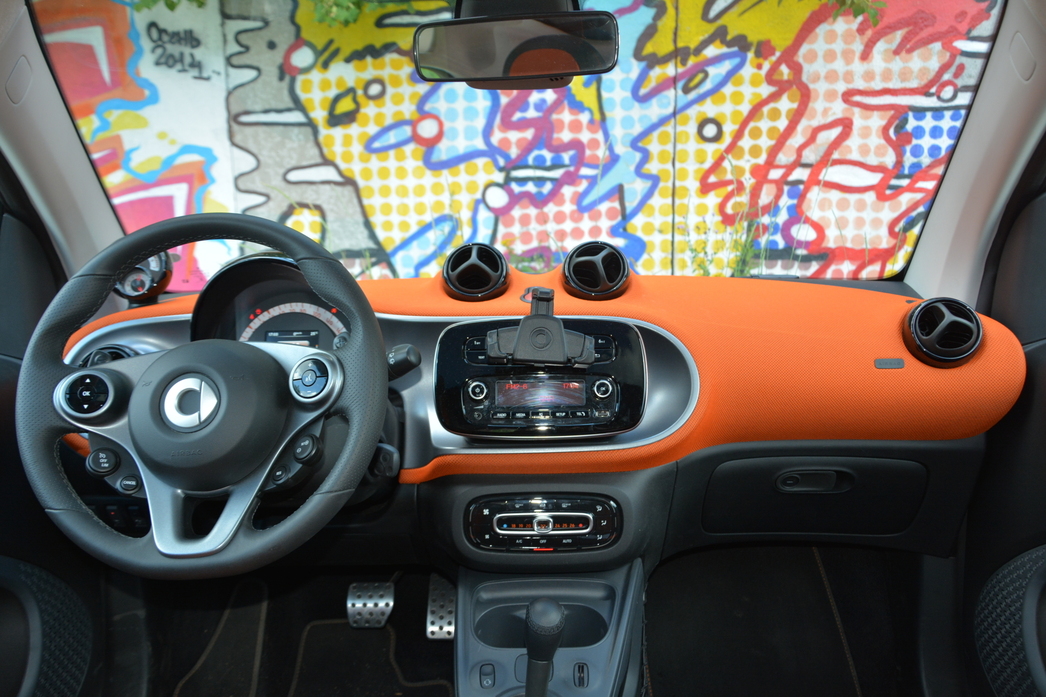 За это стоит «благодарить» прокрустово ложе платформы Twingo с ее габаритами и компоновкой. Это у старого Smart ForTwo ноги водителя и пассажира болтались где-то в переднем бампере, а тут — «капот» у него, видите ли. Но на этом, пожалуй, и заканчивается коротенький список неоднозначных изменений, случившихся при смене поколений. Например, дизайнерам интерьера машинки можно поставить твердую пятерку с плюсом. Вроде и ничего особенного, все тут простенько и молодежненько. Однако ни на секунду не покажется, что дешево и попсово. Ощущения абсолютно иные, нежели от дешево-игрушечного салона «исходника» — Twingo. Вроде и приборная панель похожа, с таким же «циферблатом» по периметру, и верхушка центральной консоли аналогичная. Но иной блок управления климатом, со шкалой температуры словно в старом радиоприемнике, и общее впечатление совсем иное. Последняя стилистическая точка, завершающая образ — фирменный смартовский «будильник» тахометра, воткнутый в «подоконник» возле левой передней стойки.