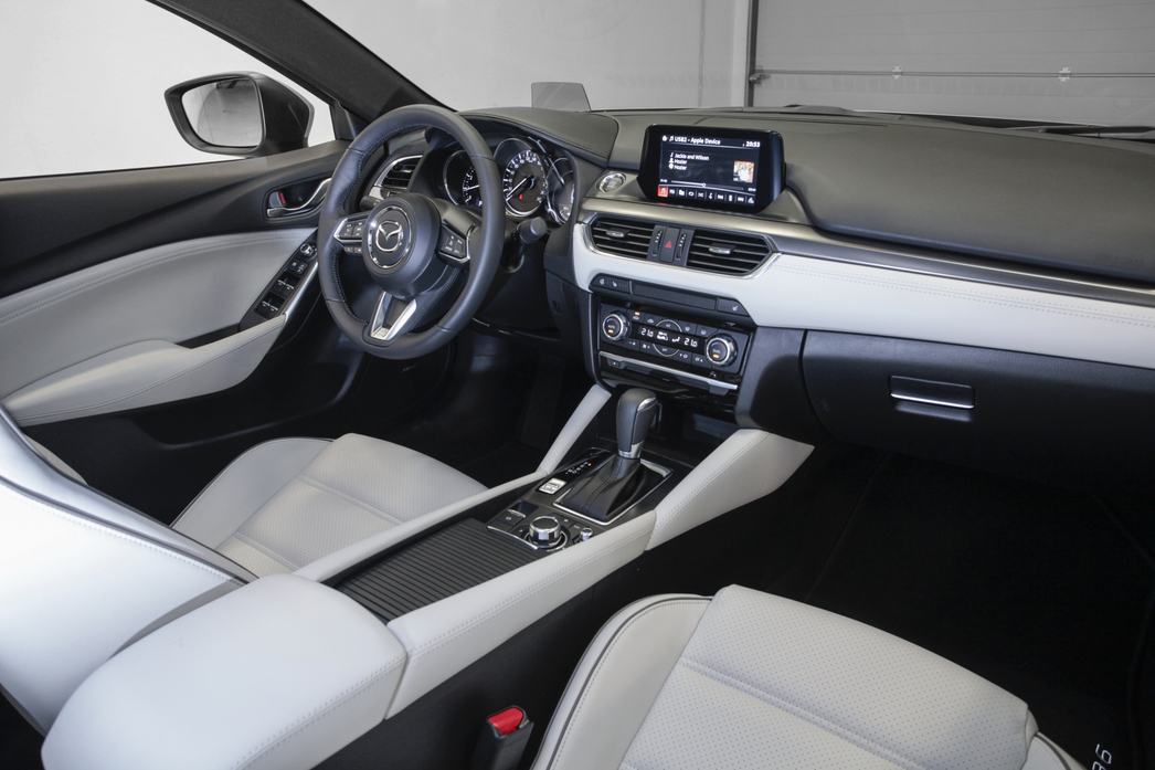 В отличие от коллег из Toyota, представители Mazda не кричат во всеуслышание о том, что их машины «играют в премиуме». Однако салон обновленной «шестерки» оставляет именно такое впечатление. Судите сами: белоснежные кресла, обнимающие нежно, но крепко — как возлюбленная при первом поцелуе — отделаны кожей Nappa. С ними контрастирует черный потолок, облагороженный прозрачным люком со шторкой. Профессиональная акустика от Bose выдает глубокий бас — серные пробки из ушей вылетают уже на половинной громкости.