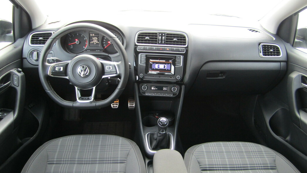 Едва попадаешь в салон, как эти же шильдики GT на передних порогах не дадут усомниться в том, что находишься внутри «заряженного» Polo. Интерьер автомобиля может похвастаться трехспицевым кожаным рулем с по-спортивному подрезанным снизу ободом и клетчатой расцветкой кресел. Изначально отделка шотландкой появилась у Golf GTI первого поколения еще 40 лет назад. С тех пор сиденья в клетку стали визитной карточкой «спортивных» моделей от Volkswagen.