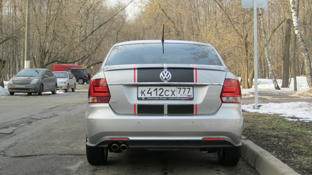 Если посмотреть на машину сзади, можно отметить сдвоенные патрубки выхлопной системы, слегка затемненные фонари и аккуратный спойлер на крышке багажника, на которой также имеется символика «Джи Ти». Такое количество спортивной атрибутики на корме седана явно намекают на то, что соседи по потоку будут наблюдать Polo GT в основном в этом ракурсе.