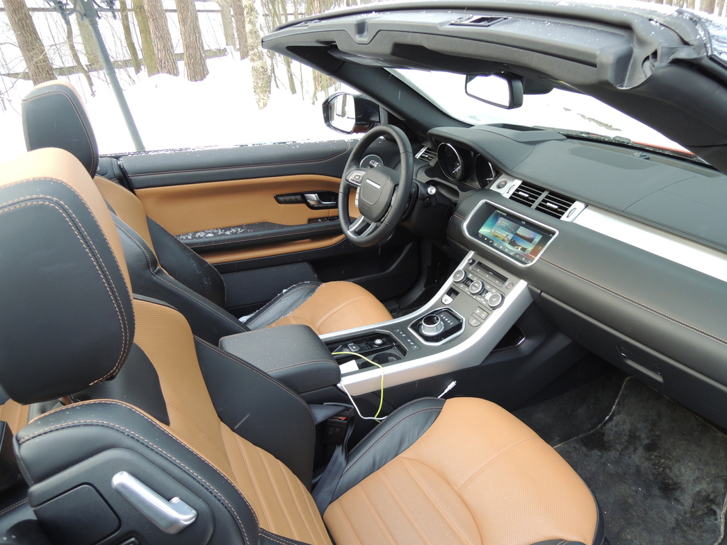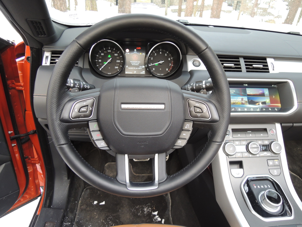 В целом же — ощущения как от обычного Range Rover Evoque, разве что на центральном тоннеле притаилась заветная клавиша, которая убирает складной верх в нишу над багажником. Прямо по центру разместился большой цветной дисплей с функцией touch-screen, обладающий хорошей четкостью и яркостью — информация с него читается без проблем в любую погоду и любое время суток — однако по-прежнему так и несумевший до конца победить свои извечные «болячки». Временами происходят зависания, подтормаживания, а иногда даже и самопроизвольная перезагрузка. Причем прямо на ходу.
