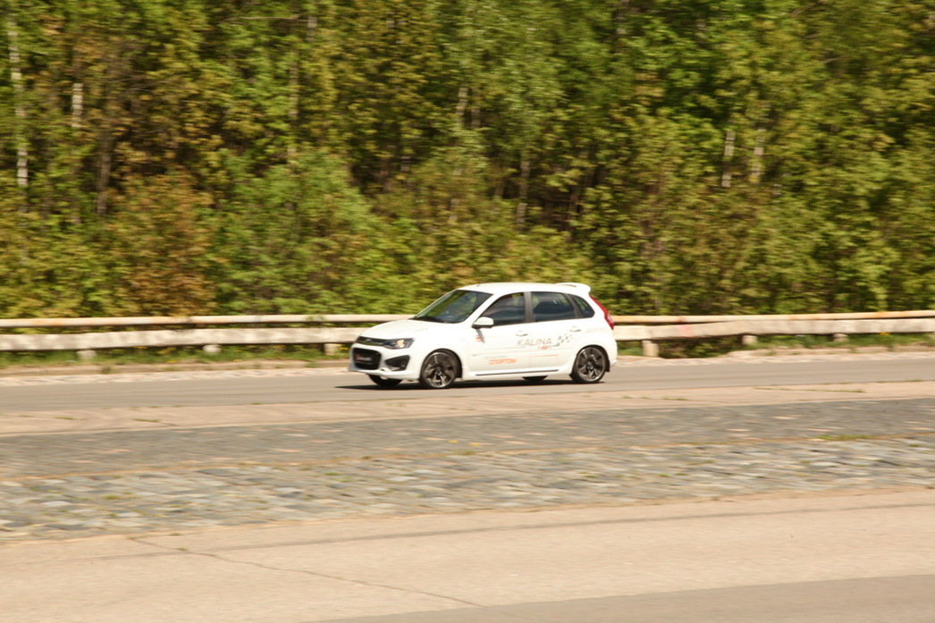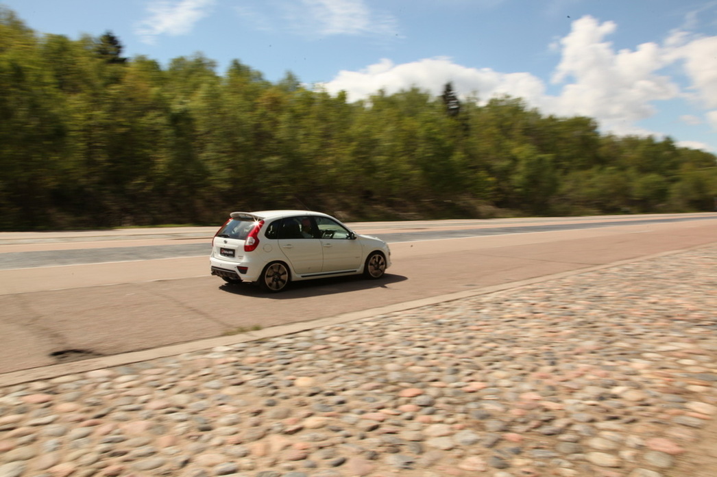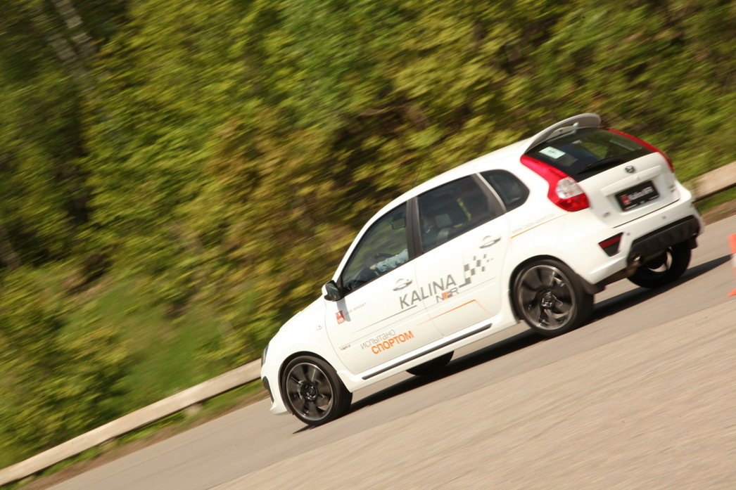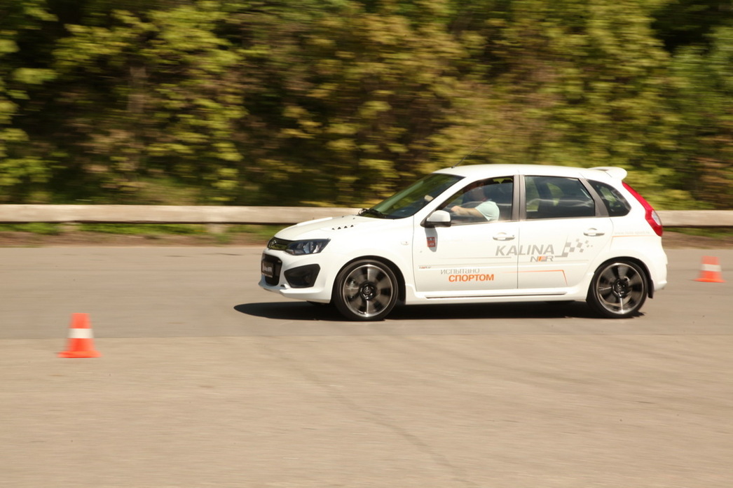 А вот и «змейка». LADA Kalina NFR проходит ее уверенно, а каждый новый маневр рулем — выверен и точен. Вываливаю на полигонную брусчатку — то еще испытание для подвески любого автомобиля. По ней NFR «прошлась» предсказуемо жестко. Ход подвески минимален, что, конечно же, сказывается на комфорте не в лучшую сторону. Но мы не забываем, для кого и зачем сделана эта LADA тольяттинским подразделением автогиганта LADA Sport.