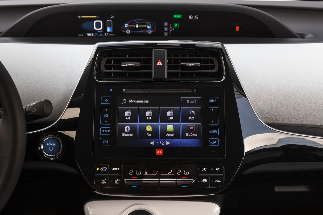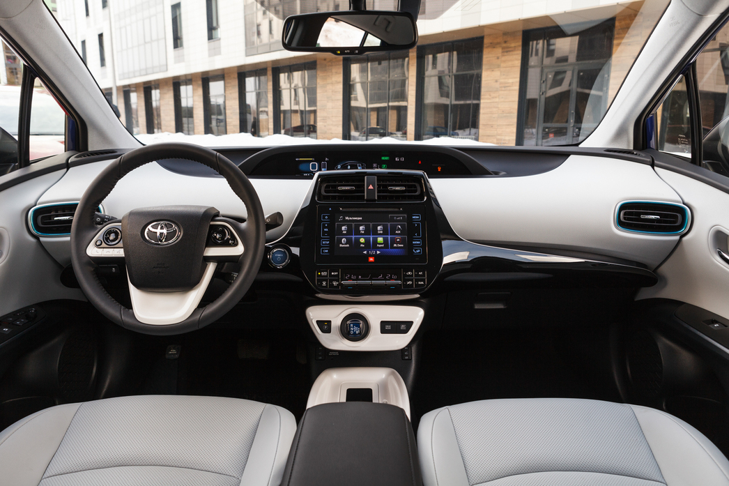Зато салон заслуживает отдельного расшаркивания. Конечно, до изящества Citroёn, четкой продуманности «немцев» или до подчеркнутого космополитизма современных Ford и «корейцев» интерьер Prius не дотягивает. Но все эти отдельные подиумы для селектора трансмиссии, «переключалок» круиз-контроля справа от руля и, конечно же, мультимедийная «приборная панель», расположенная традиционно по центру «подоконника», делают Prius чуть ли не единственной на сегодняшний день Toyota, обладающей интересным и приятным «лицом». Да и качество кожаной отделки салона машины — вполне заслуживает всяческого одобрения.