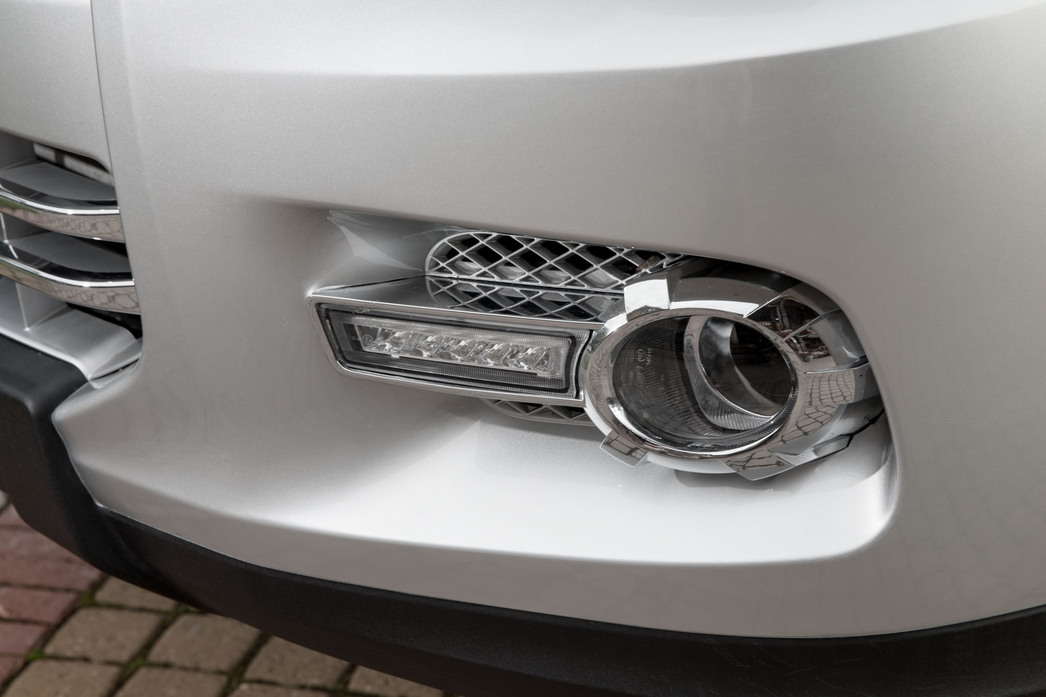 Но стоит зайти спереди и посмотреть ему «в глаза», как вся брутальность рассыпается в пух и прах. Представьте себе накаченного гиганта с наивной детской мордашкой. Чем руководствовались китайские дизайнеры, рисуя такое «лицо», остается догадываться. В стилистике передней части внедорожника читается громкий привет из конца девяностых, и, судя по характерным закругленным слегка приплюснутым фарам, производитель нашел повод для ностальгии по старому доброму «биодизайну». А уж замысловатый китайский узор на миниатюрной решетке радиатора с круглым логотипом уносит в совсем глубокую историческую эпоху автомобильного дизайна.